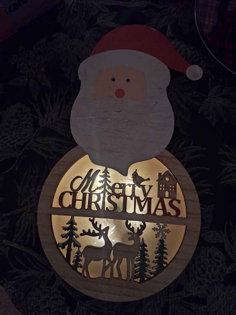 NEW with tags. Wooden Santa decorative light up hanging sign. The sign says "Merry Christmas". The sign is 11 1/2" tall & 6 1/2" wide. Willing to meet in Modesto.