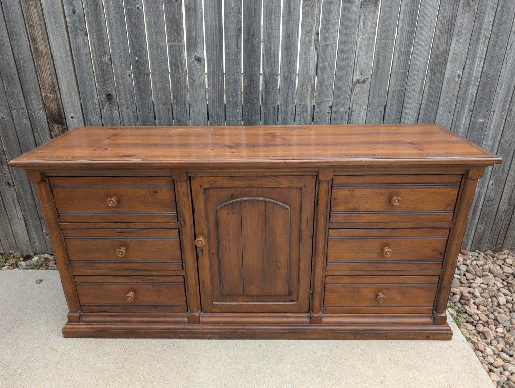 Large Wooden Dresser from the Drexel Heritage line. Six drawers with a center cabinet that contains 3 more drawers. MSRP: $1200 Wood is in excellent shape. No major blemishes, and the top surface is in great shape. Drawers function smoothly with no issues. There's also an attached mirror that sits centered on the top, back edge. I'll include that for free if you'd like it. Delivery available to Denver area for a fee. Dimensions: 67" L x 20" D x 32.5" H