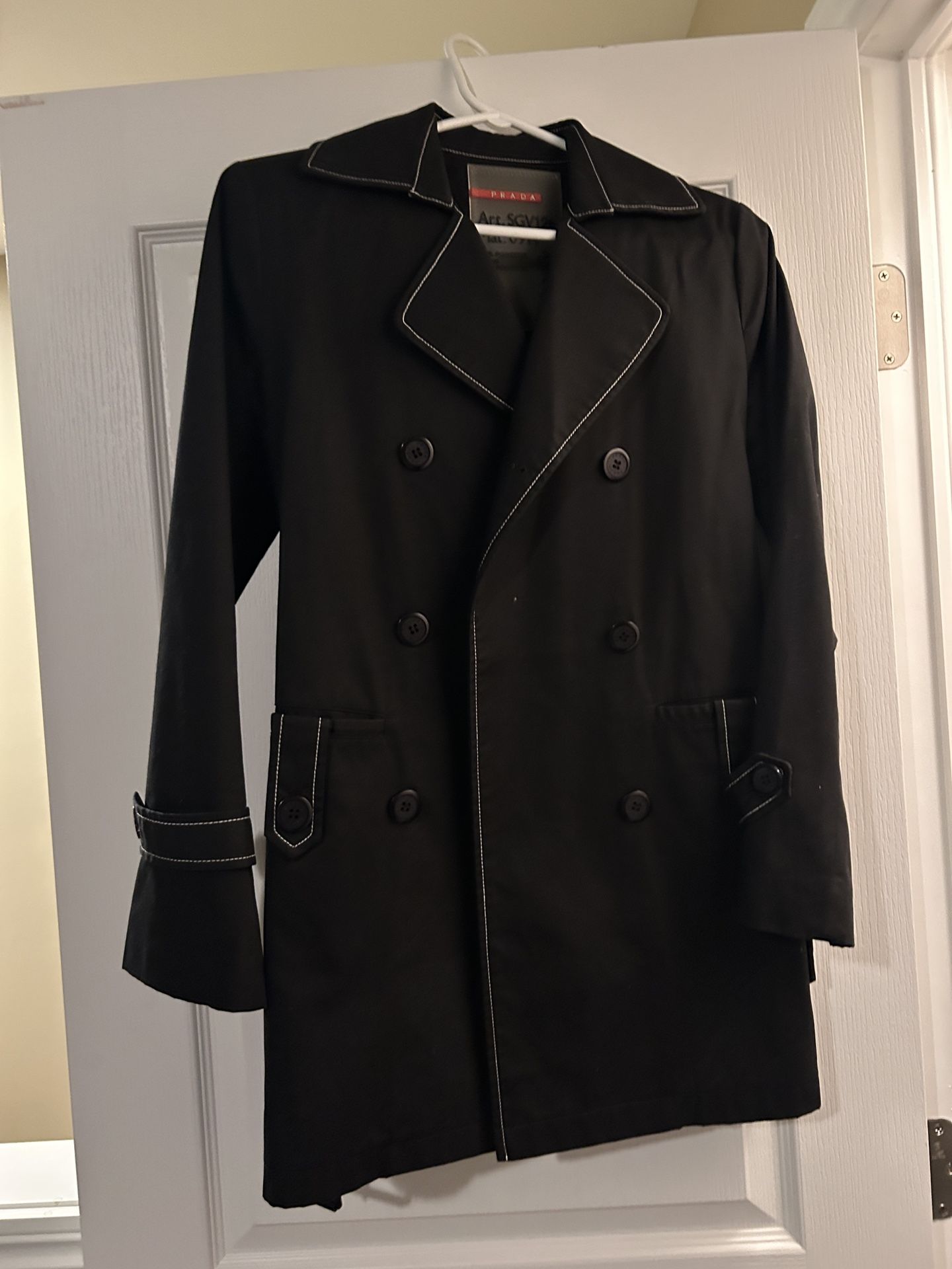 Brand: Prada • Size: XS (Extra Small) • Condition: Excellent, used one time. • Details: This sophisticated black coat features a double-breasted design with a button front closure and a tailored collar. The white contrast stitching highlights the structure of the coat and the collar, pockets, and cuffs, giving it a distinctive, modern look. The shorter length suggests it's a trench or car coat style, perfect for a sleek, luxury outerwear statement.