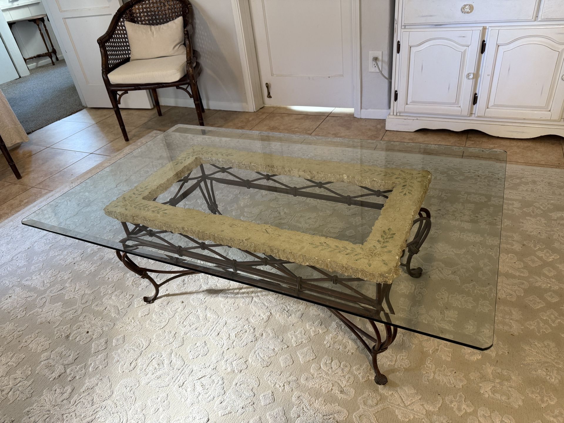 Rod Iron and Stone Coffee Table with Glass Top