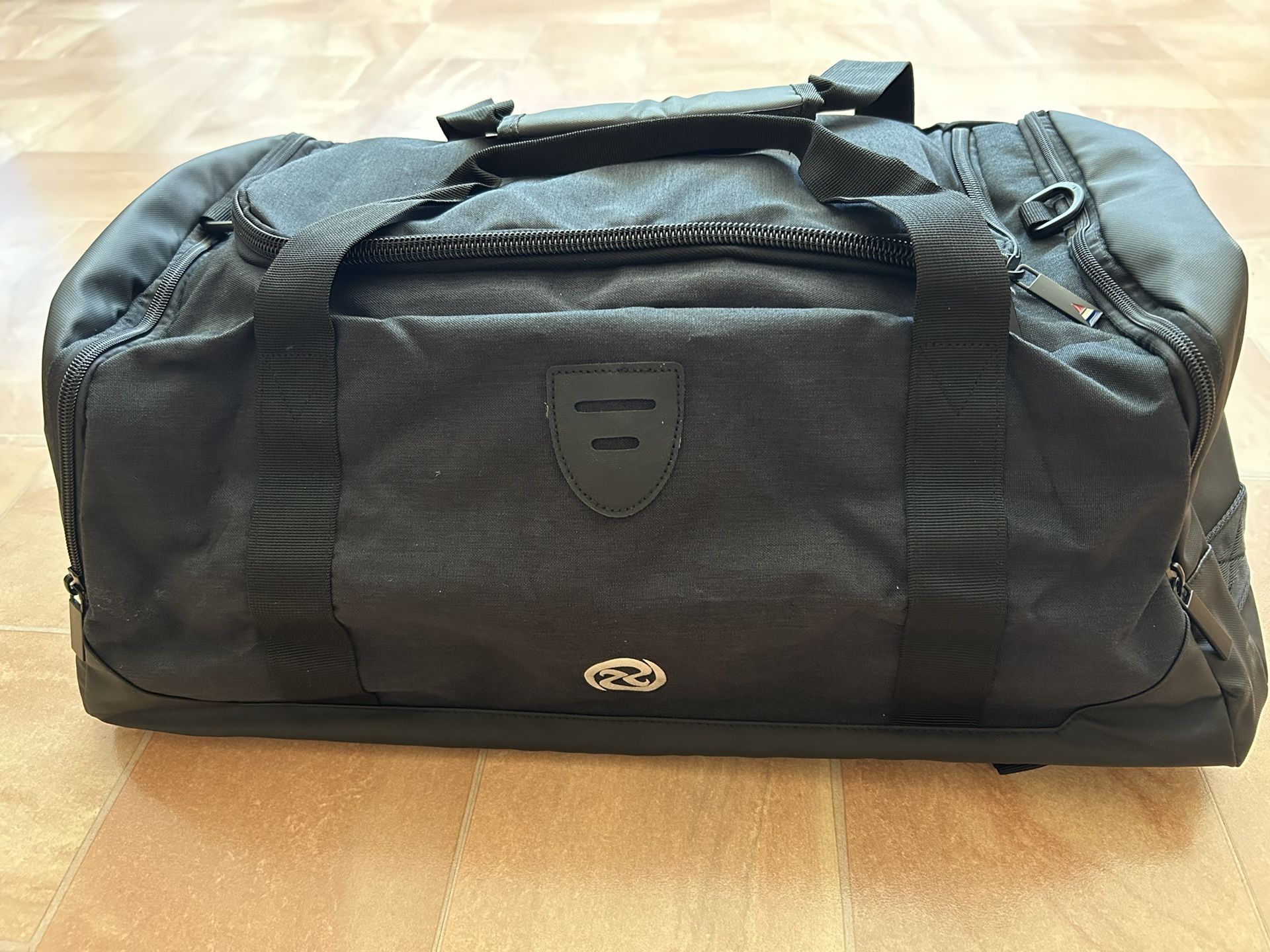 Cico Rider black small duffle. Material-leather/canvas/nylon. One side-Shoe compartment with air hole, other side zip pocket. Shoulder strap. Backpack straps hidden in zip compartment at bottom. Approx 21.5” L x 10.5” W x 10”H. New with tags. Never used, very good condition.