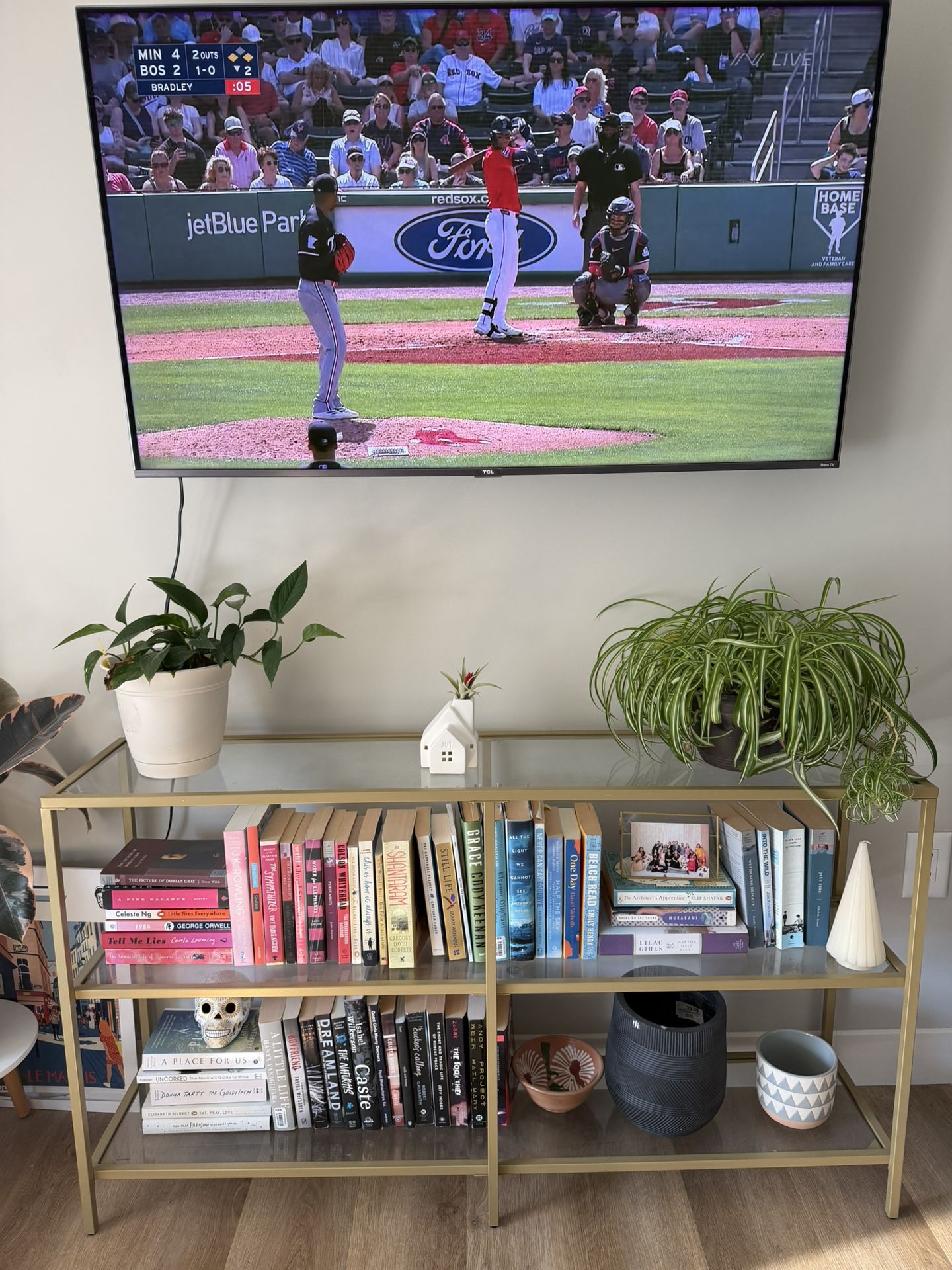 Gold console table. 51.2 inches. Great for a book shelf or underneath your tv! In great condition. I’ve had it for less than a year.