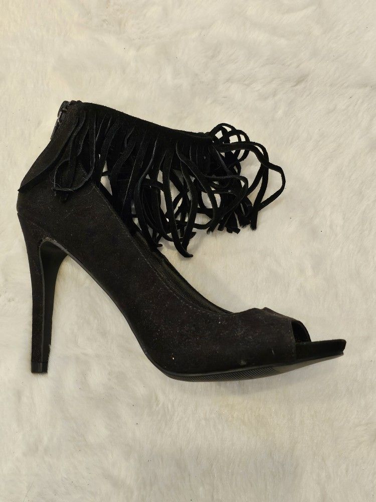 Brash Women Open Toe High Heels Black Fringes Suede Size 5.5 US/36 EU