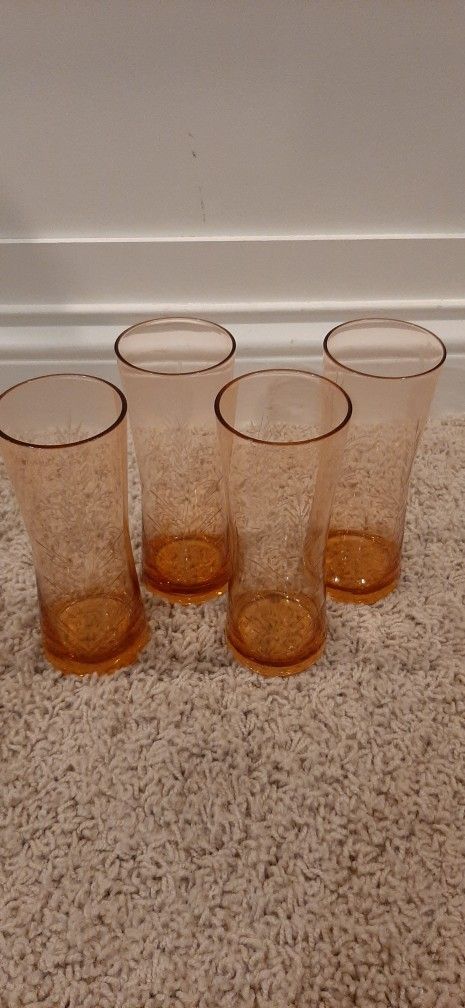 4 Vintage Etched Wheatgrass design Light Amber Depression Glasses. Collectible Glassware