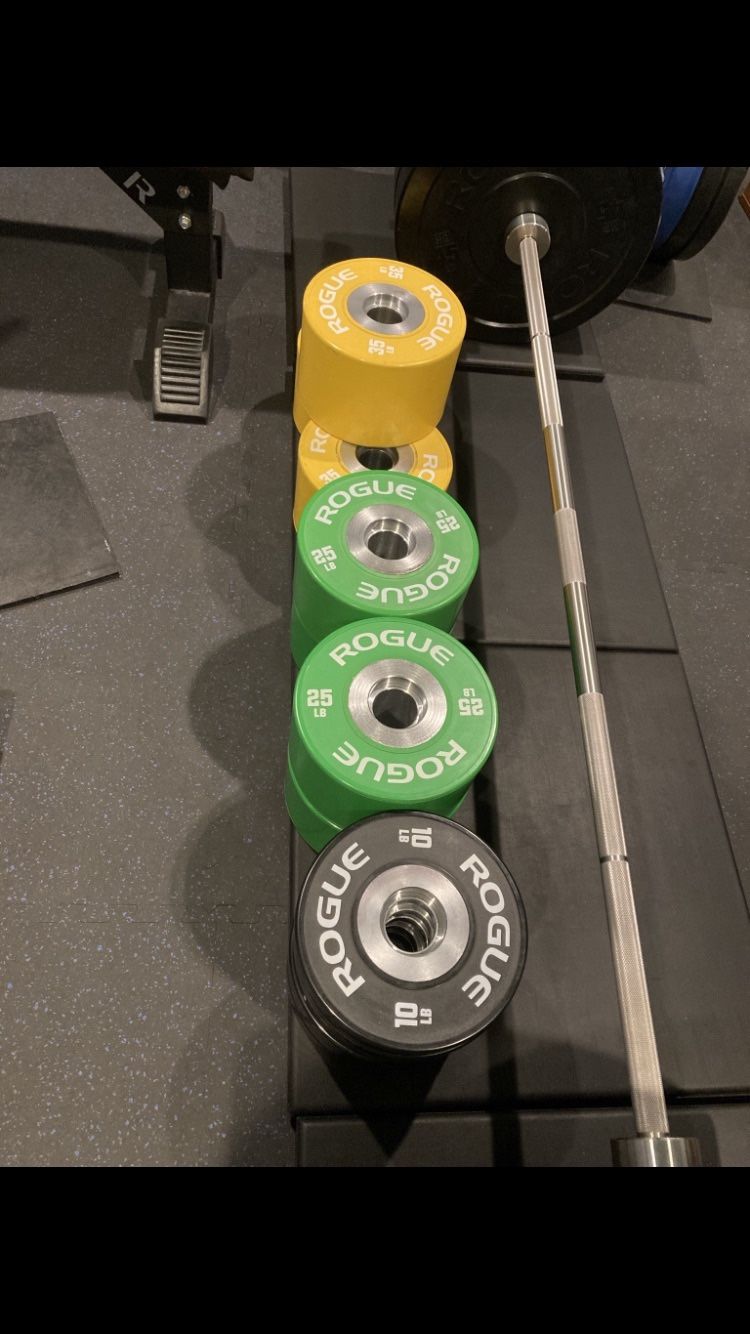 Excellent condition. The best pair of loadable dumbbell handles you can buy. They weigh 15 lbs each. Comes with 2 Pairs of Rogue OSO Billet Aluminum Collars. Can be used with any brand Olympic plates but are made to be used with Rogue dumbbell bumpers. Retails for $517.11 shipped. I have the specialty Rogue Dumbbell Bumpers included in this purchase. I have 2 pairs of 10’s, 1 pair of 15’s, 2 pairs of 25’s and 1 pair of 35’s and a loose 35 lb dumbbell bumper. See details in pictures for more information. Retails for over $1,100 shipped. Together they retail for over $1,600 from Rogue. This will replace all dumbbell sets from 15-90 saving you a lot of space in your home gym. CrossFit, weight plates, weights, bumper plates, squat rack, adjustable bench, FID, bench press, shoulder press, deadlift, exercise, workout, training, Olympic