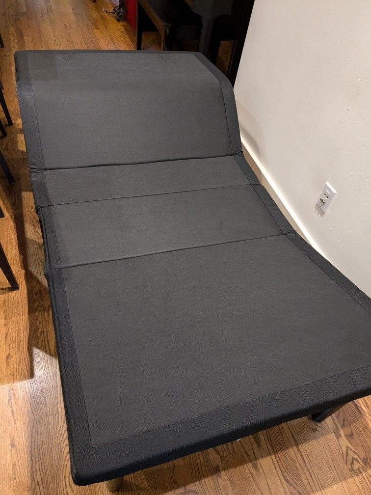 Motorized electric adjustable bed frame with remote. Purchased for aging parent but never used. Head & Foot Articulation Elevate the head and/or foot One-Touch Flat Preset Stackable Legs The base can be set to a variety of heights to accommodate different style preferences or allow for under-bed storage. Polyester with metal base. Dimensions: 38" wide x 80" long x 12-19" height Dimensions: 38"w x 80"l x (12 - 19"h)