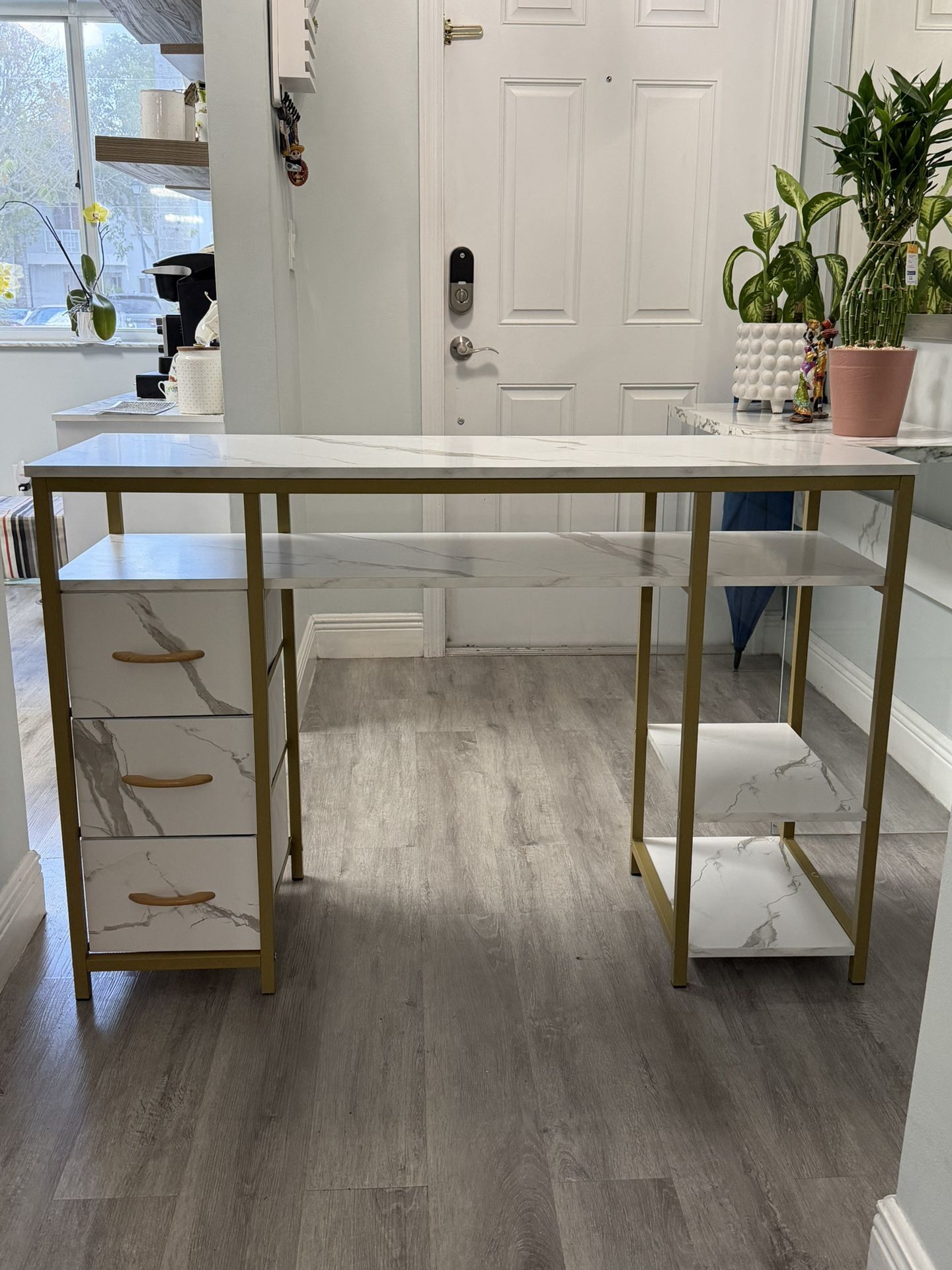 Desk with 3 drawers and shelves on the side. White marble style top with gold frame. Was used as a nail desk but can also be used as a small office desk or makeup table. Good condition. Paid about $120 for it. Pickup only.