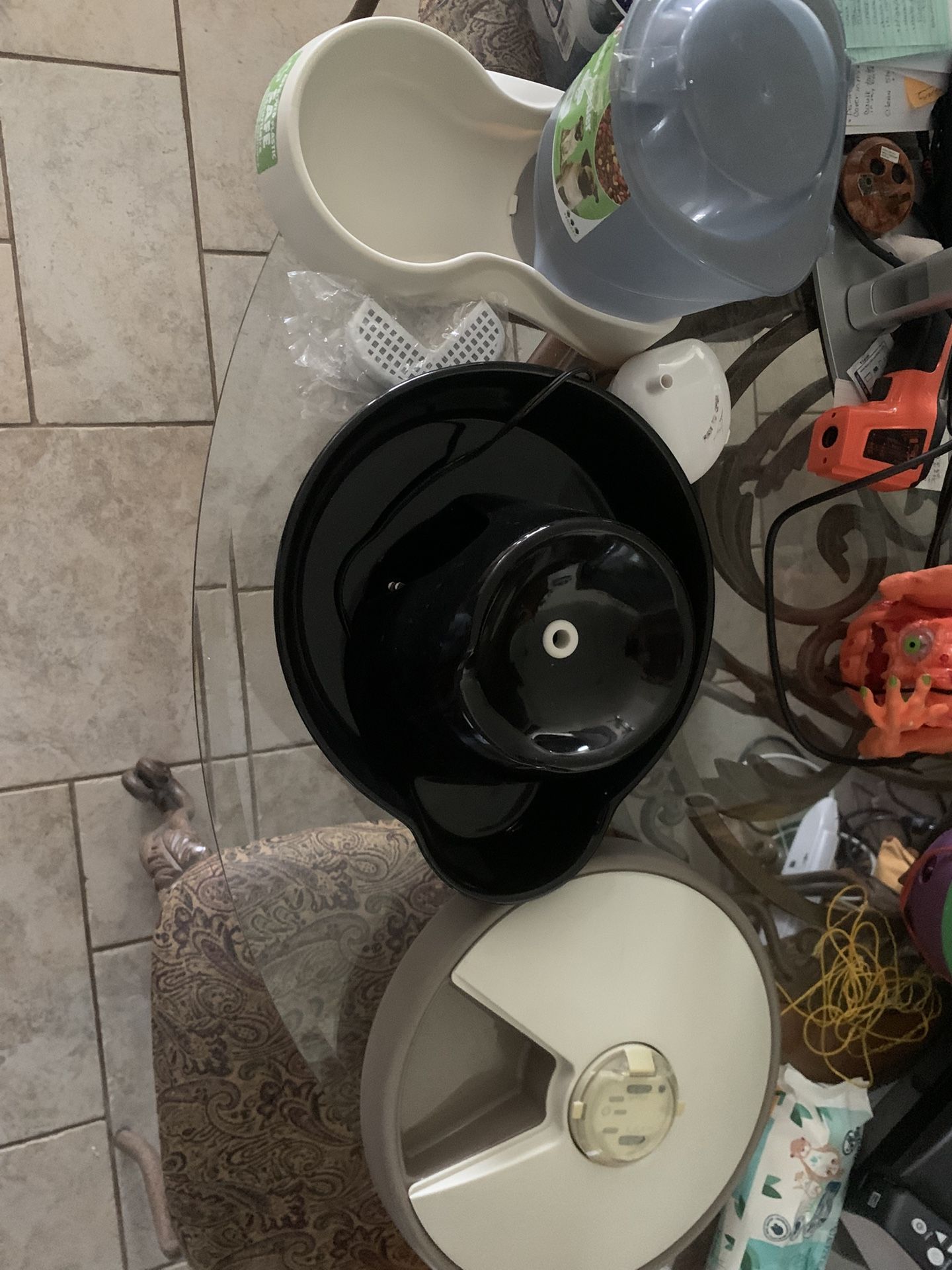 Ceramic pet water fountain with extra filters, pet food dispenser, and automatic pet feeder on a timer
