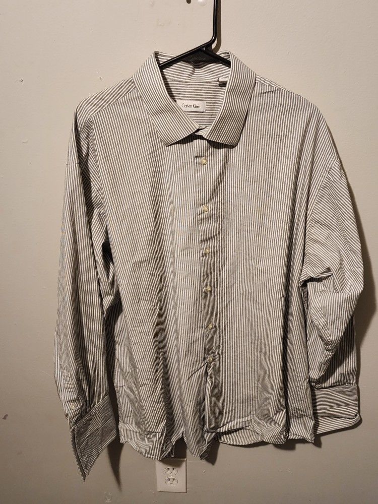 Mens Calvin Klein French Cuffed Collared Shirt. Big and Tall size large. White and Gray pin stripes asking 30$ obo. Barely ever worn I only ever used it for court appearances etc. Sorry about the wrinkles just washed because it's been hanging in my closet for a couple years. Check out my other listings will do deals for bundles.