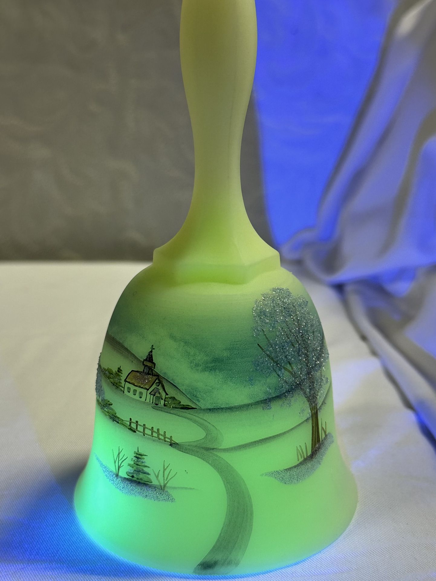 Princess House Fenton Bell: Custard Glass, Winter Church Scene This listing is for a custard bell by Fenton that glows green under a black light. It is hand painted with a winter church scene. This piece was made for Princess House and is part of their collector's edition. The bell is in excellent condition with no chips or cracks, and it has its clacker to be able to ring! Approximate Dimensions: 6"H x 3.25"W