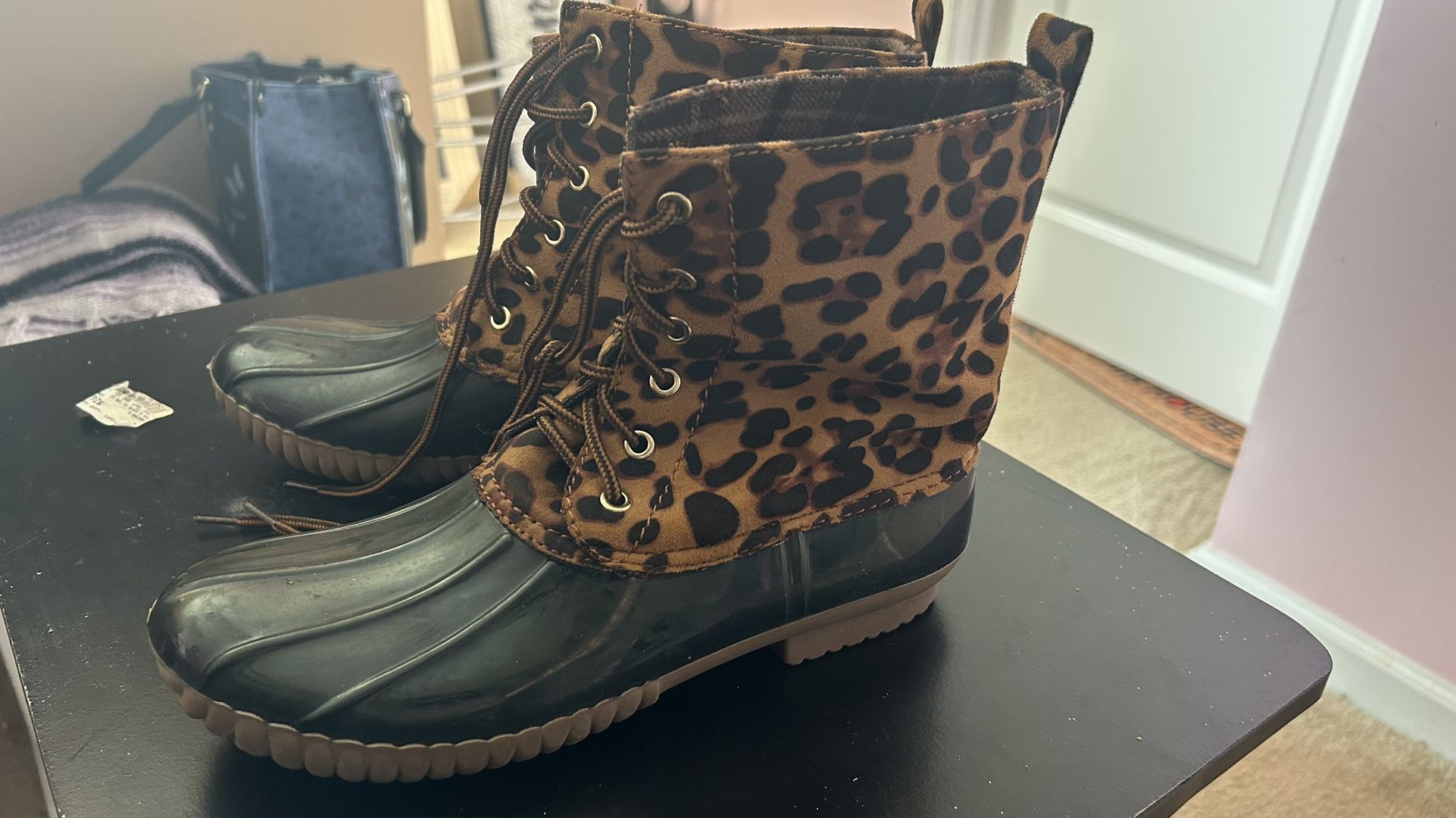 Super cute leopard print duck boots—perfect for rainy days, cold mornings, errands, festivals, or “cute but comfy” fits. ✅ Waterproof-style rubber lower ✅ Leopard print upper with lace-up front ✅ Great tread/grip on the bottom ✅ Easy to style with leggings, jeans, or joggers Condition: Pre-loved, good condition with normal light wear from use (see photos).