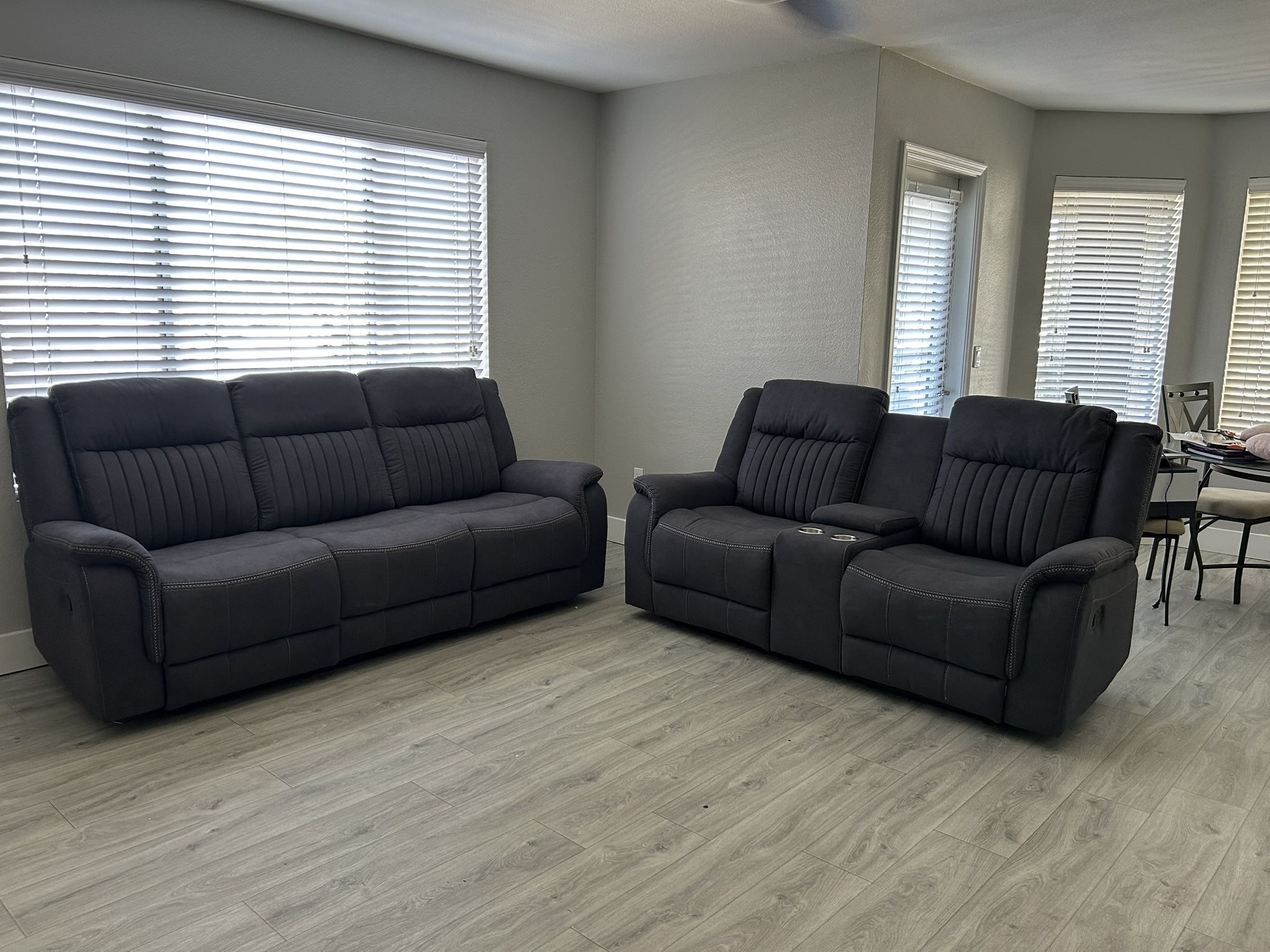 Somewhat new, bought in October but moving out so don’t need anymore, all recline except for the middle part, has 2 cup holders. Comes with both couches