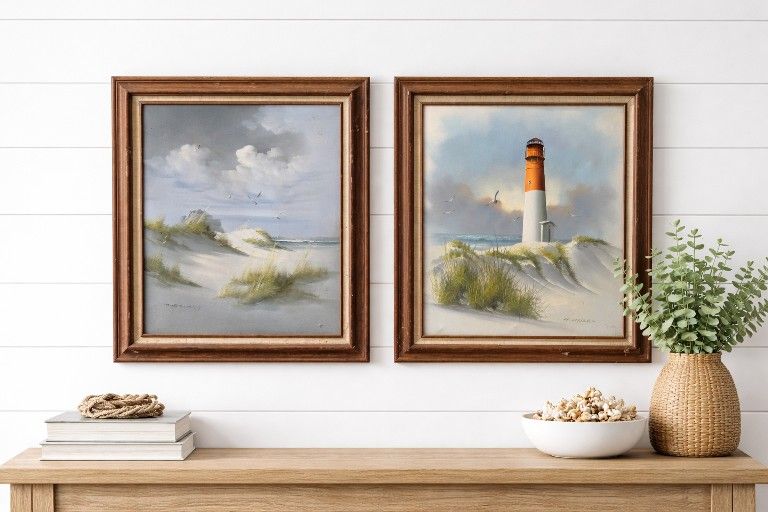 Beautiful matching pair of coastal oil paintings featuring sand dunes, ocean views, and a classic lighthouse scene. These are original painted pieces (not posters or paper prints) and come in solid wood frames with a warm, rustic finish. Perfect for: Beach or coastal-style homes Living rooms, bedrooms, hallways Airbnb / short-term rental décor Lake houses or vacation properties They look great hung side-by-side or on separate walls for a cohesive look.