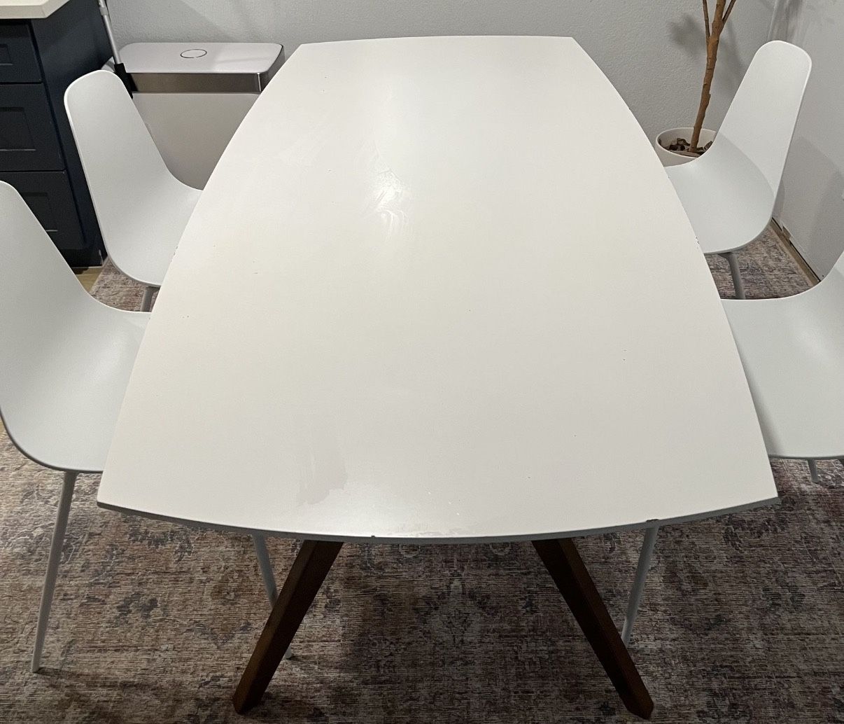 -See photos for condition of table -Chairs are in good condition -Price is mainly for the chairs, table included -*Buyer responsible for loading vehicle themselves, owner may not be available to support. Please plan accordingly* -Table is disassembled for easy transport -Chairs are assembled but buyer can easily remove legs if needed (please bring own tools)