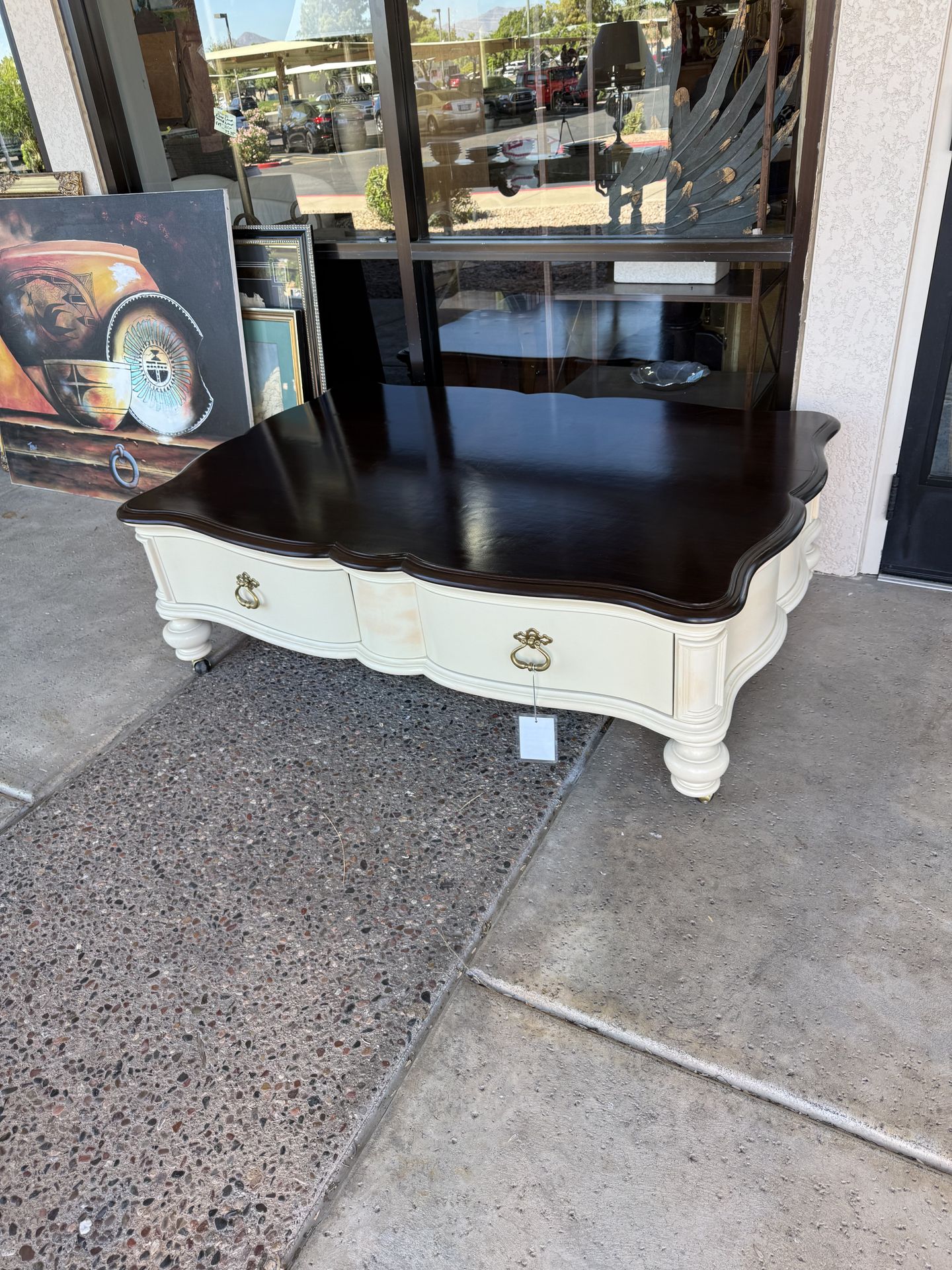 We got this from a consignment store. Their price was $825 our price $350 no tax. Approximately 40“ x 60“ x 18 inches high. There are some spots on the top that looks like somebody had items on the table. Open Tuesday through Saturday 10:30 AM to 5 PM Got Legs Furniture 8421 E. McDonald Drive Scottsdale AZ 85250