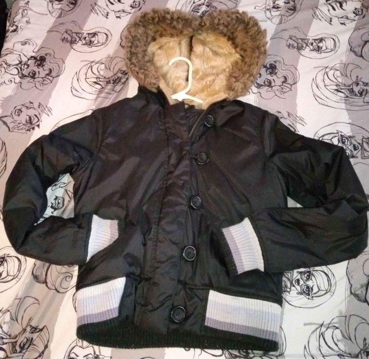 Like new small thick warm winter coat w zipper and buttons fuzzy inside etc.