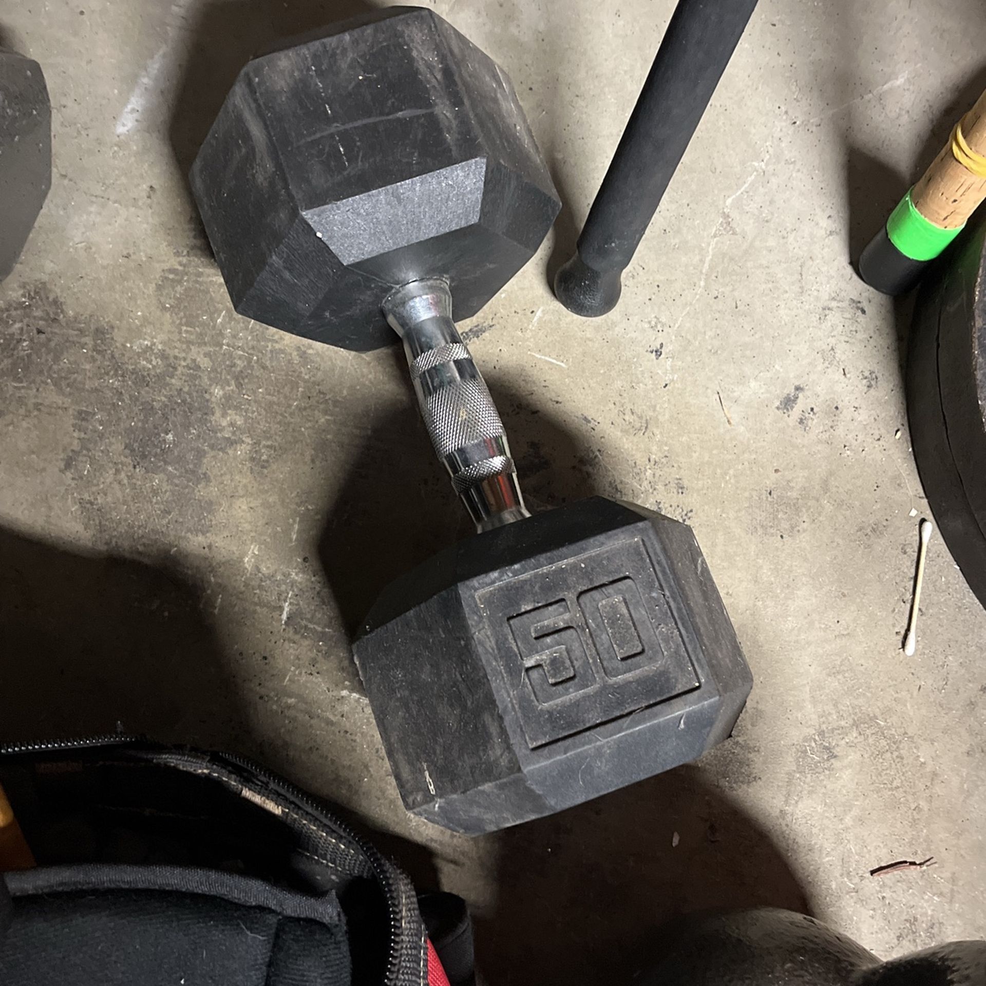 One 50lb dumbbell. Rubber Hex. Used indoors Firm on price.
