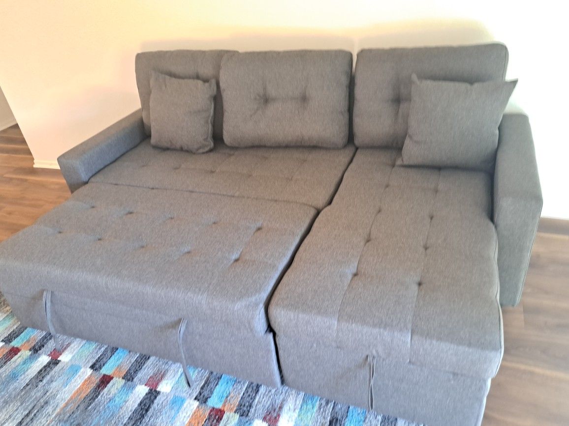 Linen Fabric Sectional Sofa with Reversible Chaise Storage and Pull Out Bed Sectional Size: 89" x 59" x 36" H Color: Gray Also Available in: Black (8008-BK) Brown (8008-BR) Brand new in the box straight from distributor 6 month factory warranty included. Do offer delivery and assembly