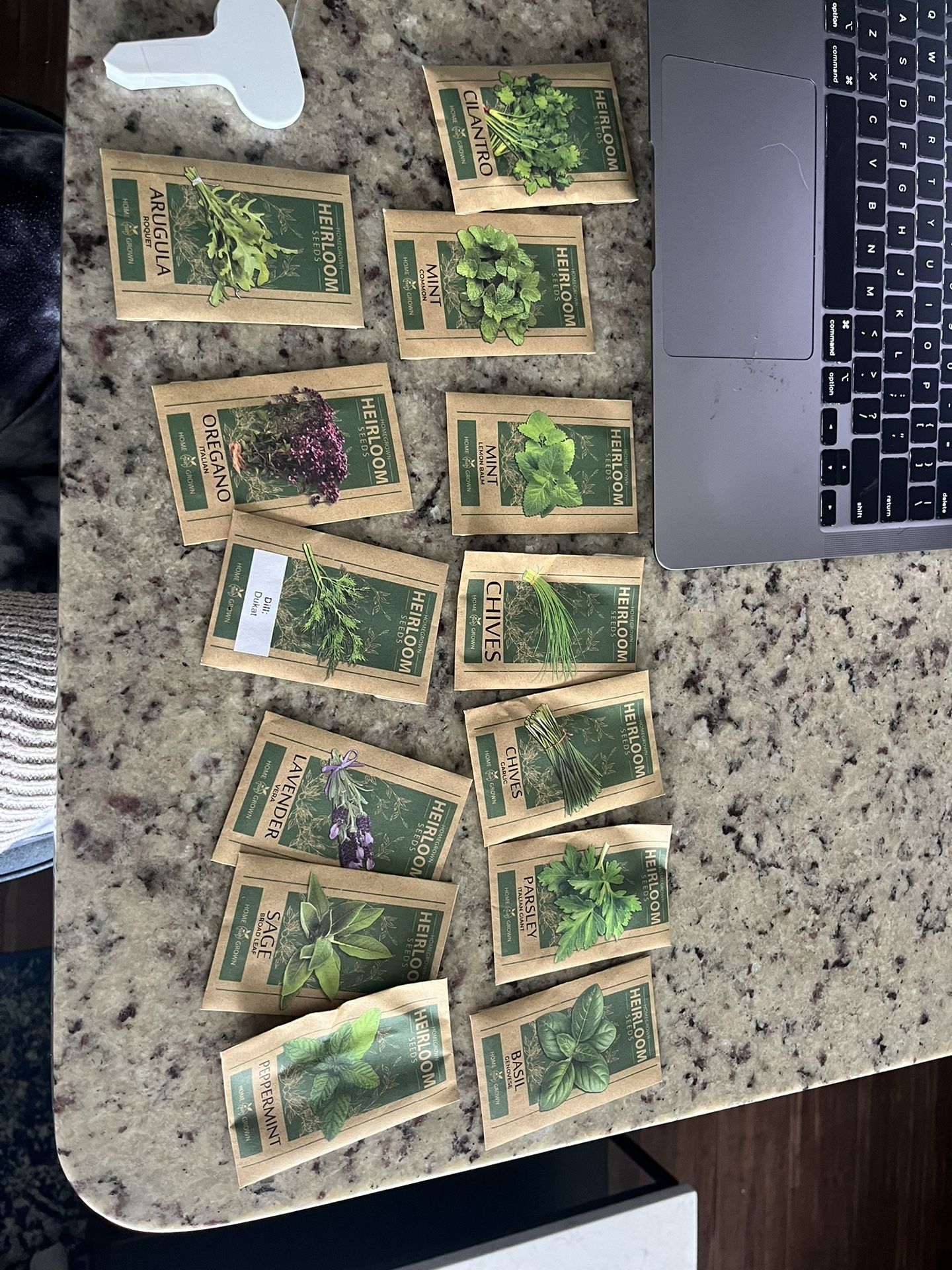 Unopened sealed packages of dill, common mint, arugula, lavender, sage, chives, garlic chives, parsley, peppermint. Comes with 13 small stakes to draw labels for each plant