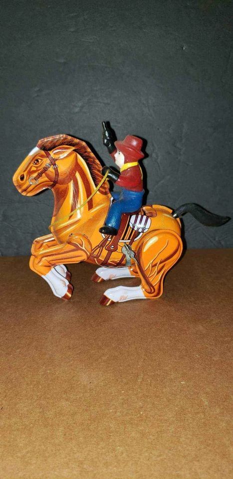 Vintage Cowboy and Horse Tin Windup Toy - MTU Korea. Gorgeous condition with the Celluloid/ Plastic Cowboy Figurine and Reigns still oresent. Winds up and runs strong- see video. Nice tin toy to add to the display or collection. By MTU toys in Korea About 5" T and about 8" Long (tail to head) $55 / Lorain pickup or Shipping Available