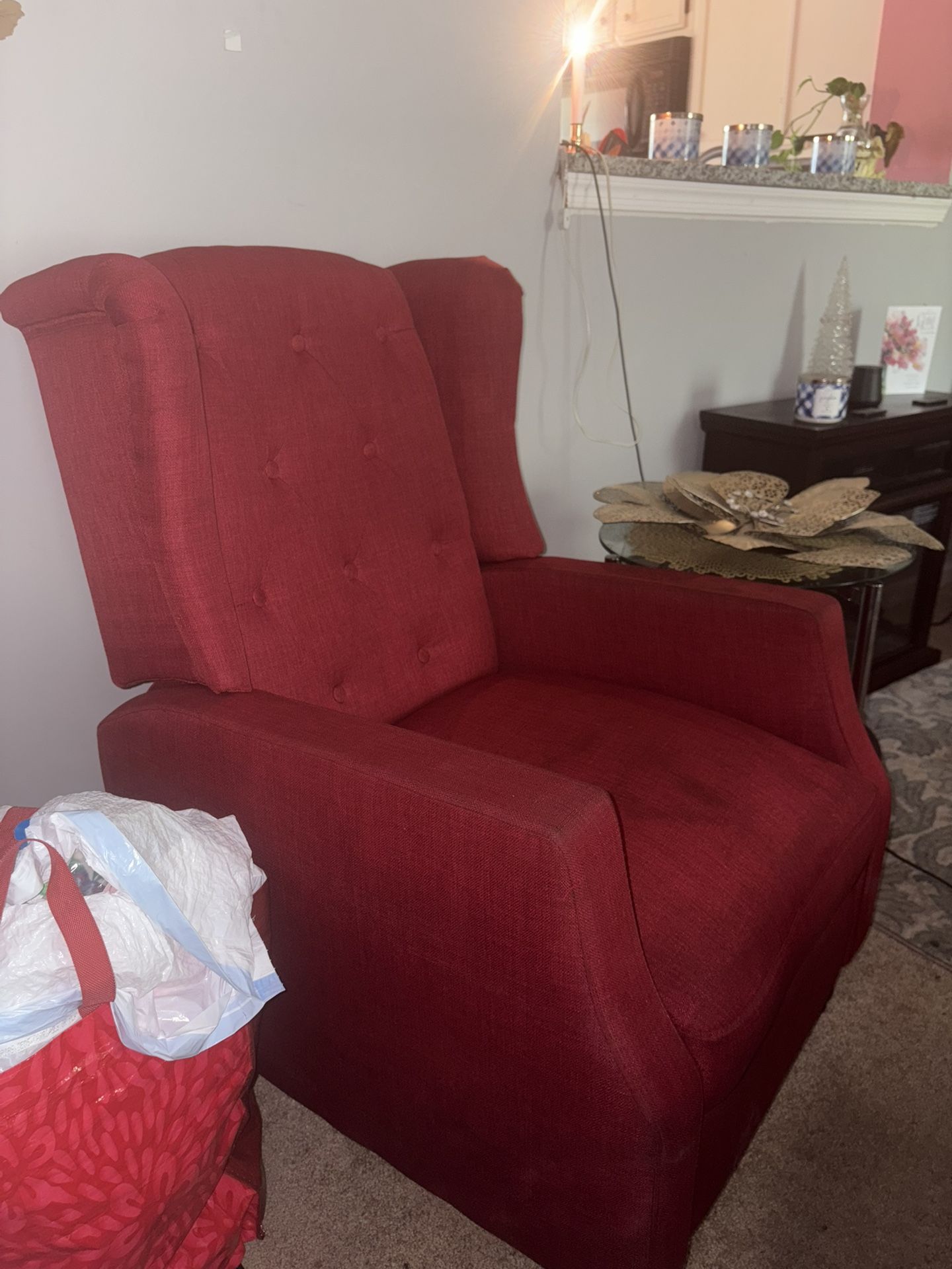 Red chairs, perfect for your living room. Some discoloration on them, but these can easily be refurbished. They’re very comfortable.