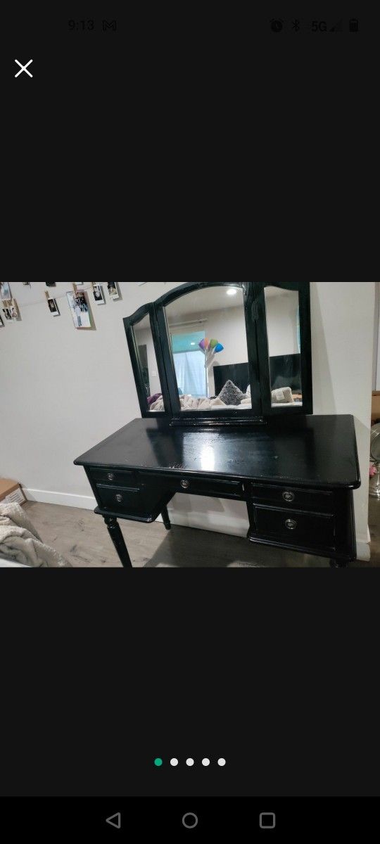 I have a black makeup table with trifold mirror 5 drawers all in great condition. We bought it for $320. A few small, scratch marks due to moving but could be retouched. All drawers work, nothing is broken. Asking $140 obo. You must pick up.