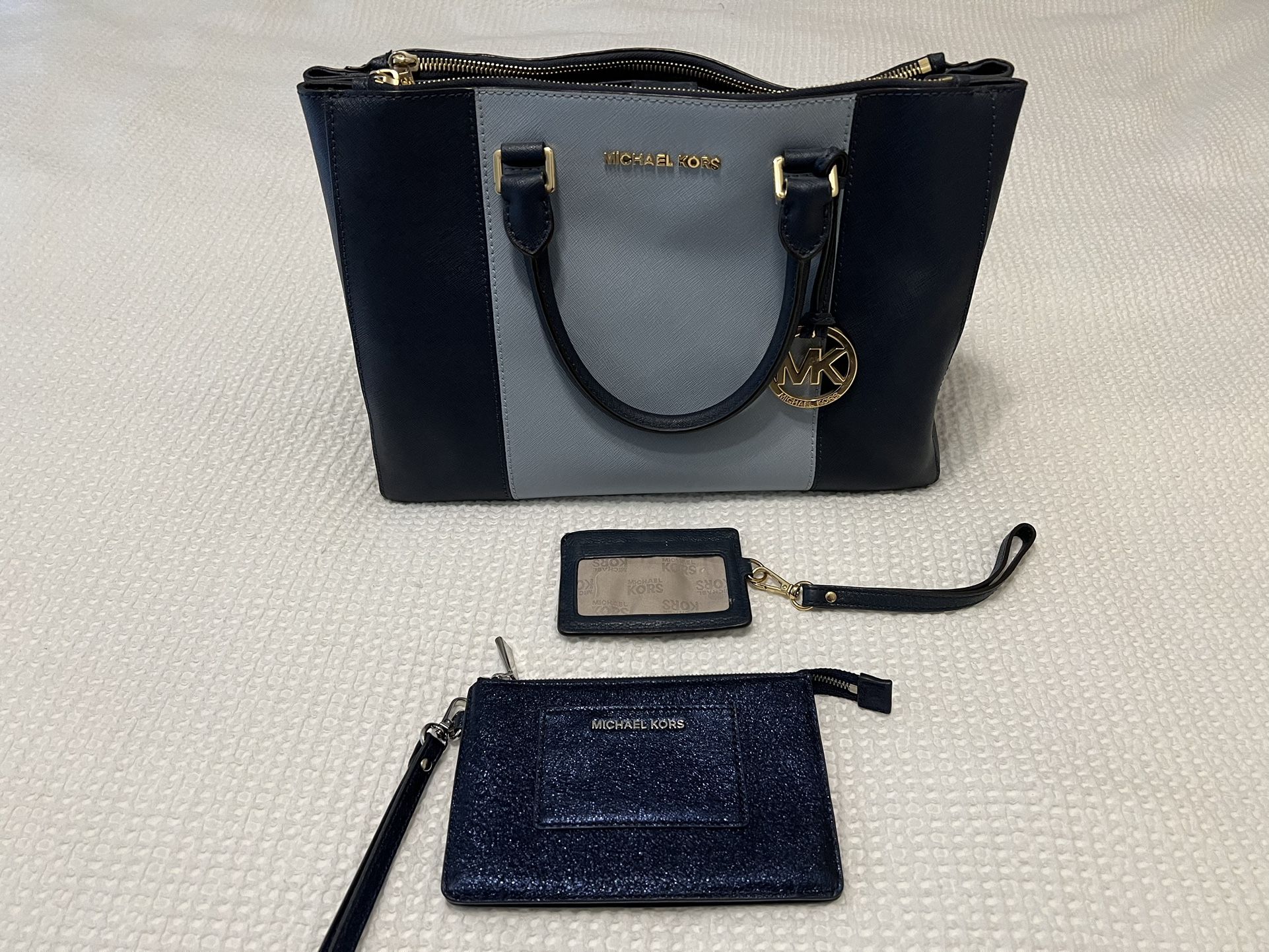 Yes it is real. If it is on here it is still available. Comes with 2-Tone Blue purse, blue clutch, and blue ID carrier. All accessories with bag. All Michael Kors. Asking $120