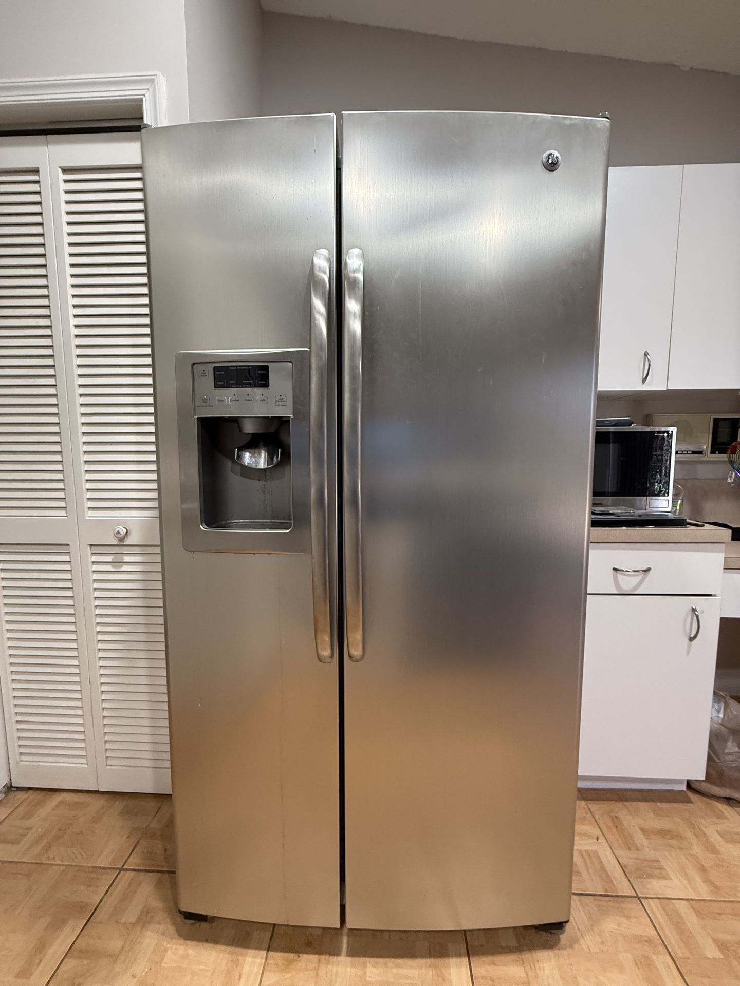GE side-by-side refrigerator (model GSHL5KGXCCLS) in good working condition. Features: • Stainless steel finish • Ice maker and water dispenser • Large 25 cu ft capacity • Adjustable shelving Keeps temperature well and functions properly. Needs to be cleaned Pickup required