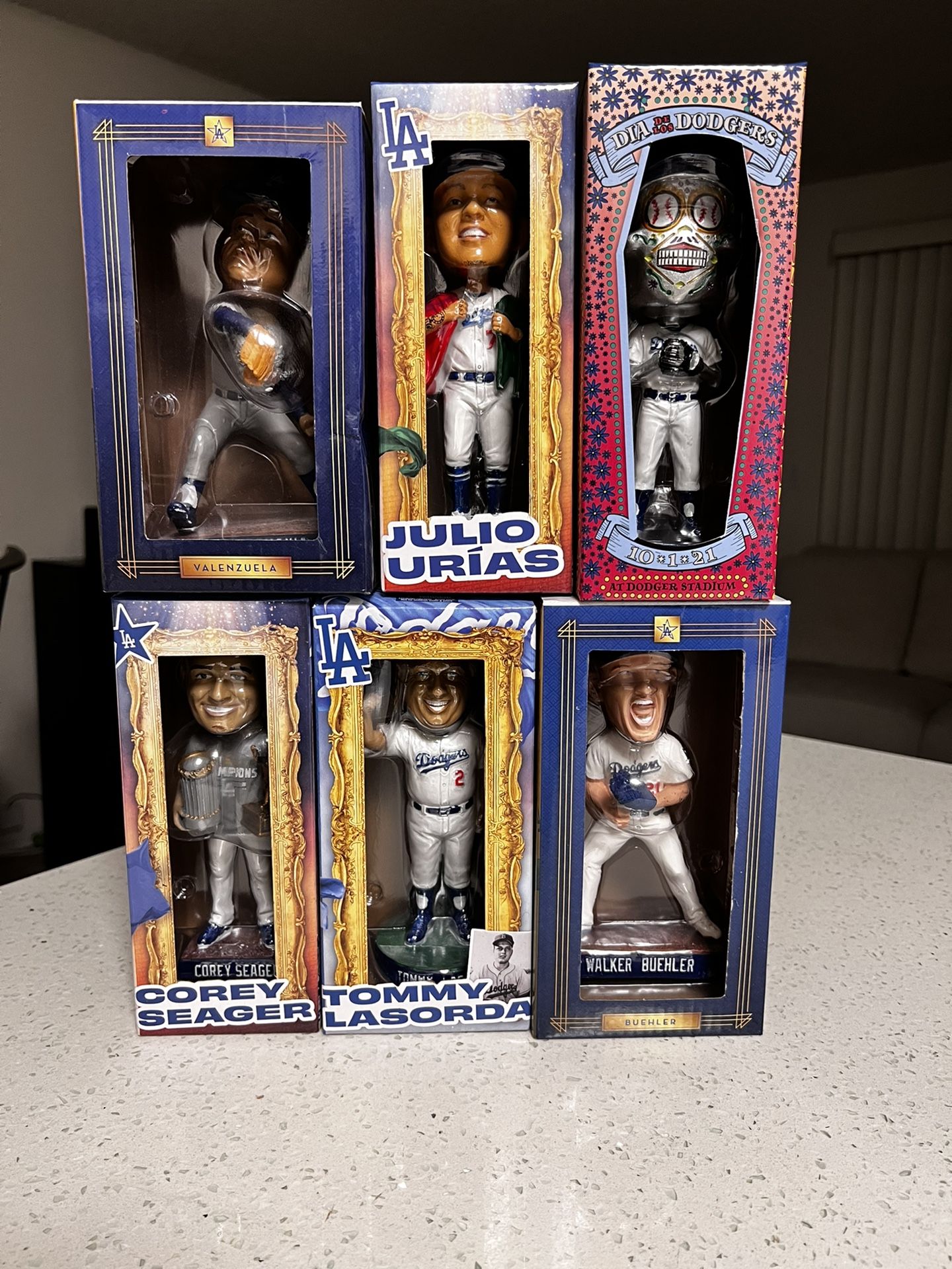 Brand new in box never opened. I have bobbleheads from 2021 that were supposed to be given out 2020 but were given out 2021 due to COVID 19. PRICE IS OBO. NO LOW BALLERS. SELLING ALL TOGETHER Fernando Valenzuela Julio Urías Día De Los Dodgers (special limited promo) Cory Seager Tommy Lasorda (R.I.P) Walker Buehler