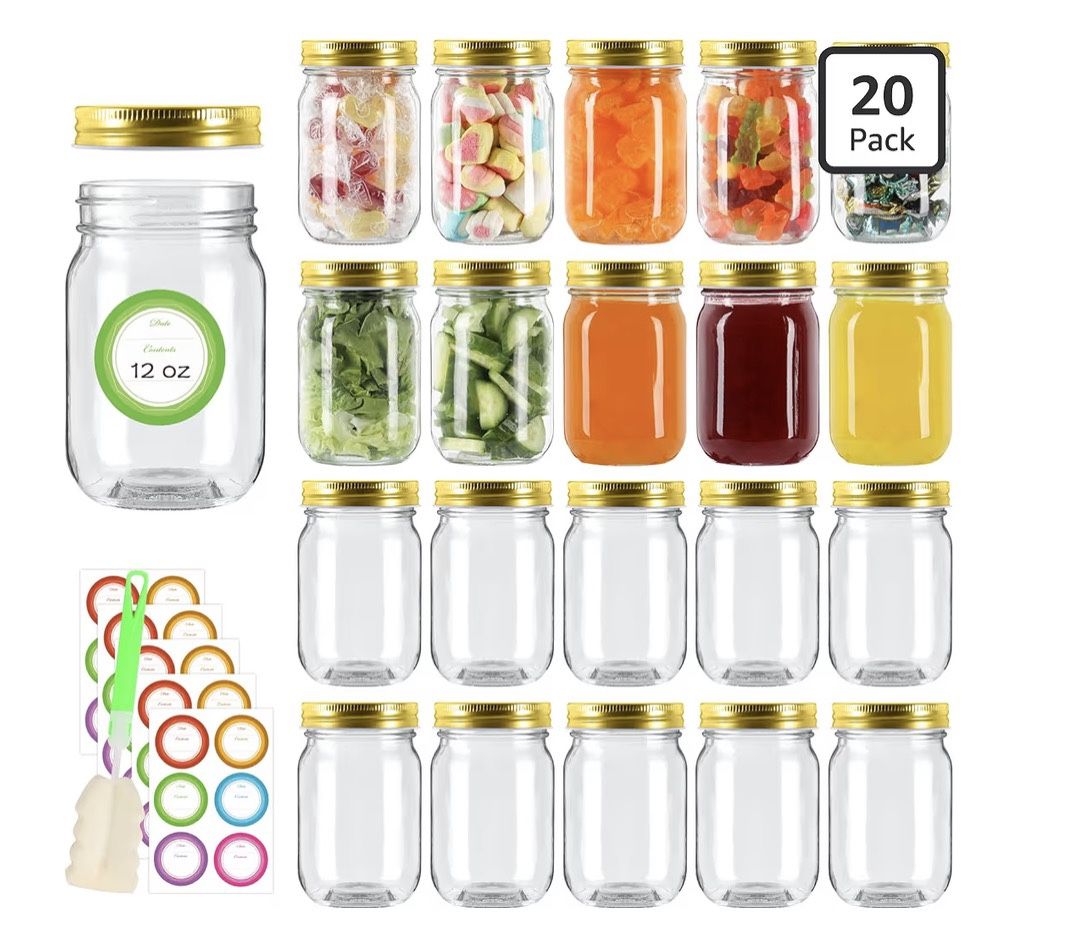 (121212-8) 20 Pack 12 oz Mason Jars with Gold Lids, Regular Mouth Glass Canning Jars with Labels and Brusher for Storage, Canning & Preserving, Dishwa