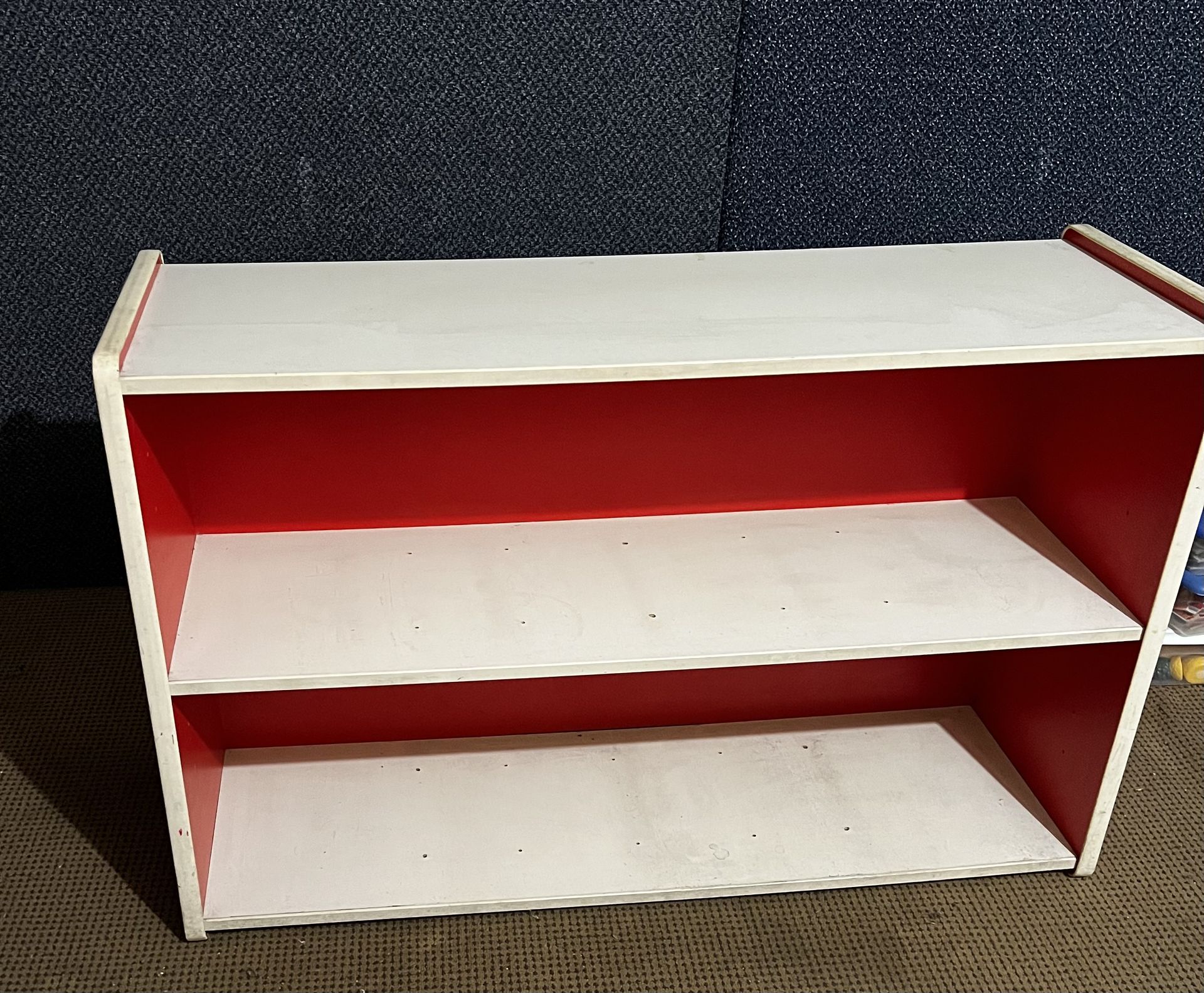 Large wood red toy shelf 46.5”x 30”x 15.5” Pick up near 805 and Palm Ave, 92154 area