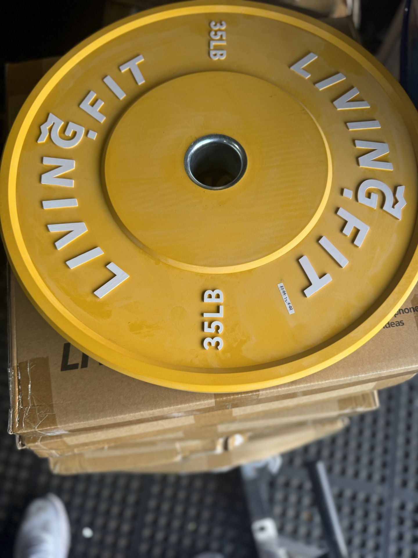 This living fit 35lbs plate is amazing, rubber covered, yellow, brand new, in box… $50 each.. $80 for the set of 2. If you buy 6, I’ll include a rack to hold the plates ($240) And for $60 more (only if you buy the 6 plates) you’ll get the bench and the part to rest the bar Price is firm