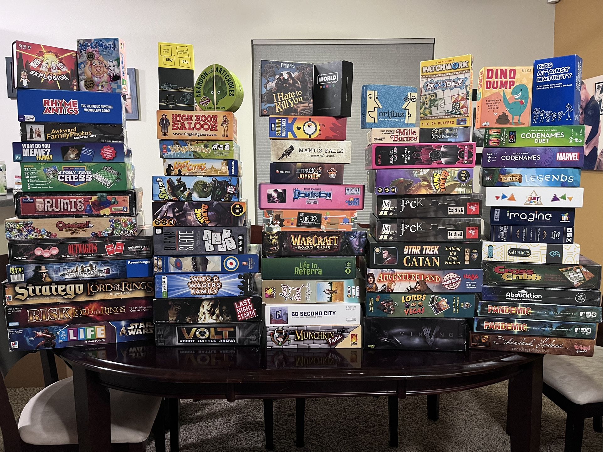 Who's in your top 3?? Grant, Taft, Harding. Don't @ me. OK, this consolidates all of my listings into one. However, I've added some new games and have also dropped prices on several. $5 - Awkward Family Photos (NIS) $15 - Volt (NIS) $15 - Wits & Wagers: Family (NIS) $50 - London’s Burning $OLD!!! - Risk: The Lord of the Rings Middle Earth Conquest Game $OLD!!! - Stratego: Lord of the Rings $15 - The Game of Life: A Jedi’s Path $5 - Rumis (AKA Blokus 3D) This game is missing 1 green piece. This makes the game unplayable at 4. However, it is fully playable at 2 or 3 people. The box is functional, but won't win any beauty pagents. $15 - High Noon Saloon - Opened but unplayed. Cards in box are still in shrink. $35 - Dominion: Guilds Expansion - Opened but unplayed. Coins are unopened in the box. $15 - Dino Dump - Rare and hard to find. The game is complete. It just doesn’t have the silly stickers that go with a new game. Stickers have nothing to do with gameplay. It’s just a fun gimmick for the kids. $OLD!!! - The Princess Bride: I Hate to Kill You. $10 - Abandon All Artichokes $10 - Kids Against Maturity $15 - Exploding Minions. Played only once. $5 - Mille Bornes. Vintage copy. It smells quite vintage. $10 - Orijinz (language and vocab) $20 - Placing the Past (history) $30 - The World Game (geography) $10 - Story Time Chess - this is a method for teaching young kids chess. This game is supposed to come with two bags to store the pieces, but I have replaced those missing bags with high quality plastic freezer bags from the luxury retailer Safeway. $20 - Codenames Duet $OLD!!! - 60 Second City $5 - What Do You Meme? Family $25 - Sherlock Holmes Consulting Detective (this is the 2014 Ystari printing. The box has some dings, but the contents are pristine) $15 - Jetpack Joyride $15 - Codenames: Marvel $20 - Rhyme Antics $OLD!!! - Mantis Falls $15 - One Night Ultimate: Bonus Roles $15 - King of Tokyo - great shape $5 - King of Tokyo: this game is well loved. Box and components have wear. One monster is even taped up due to all the battles I guess. $10 - Blank Slate $OLD!!! - Dr Eureka $20 - WarCraft: The Board Game $15 - Castle Panic: Munchkin Edition $15 - Life in Reterra $15 - Lewis & Clark $5 - SMASHUP - missing the Robots faction, but still fully playable. Take it for next to nothing. $15 - PANDEMIC- a used Pandemic for 15 sure beats the breaks off of a new one on Amazon for $50 $25 - PANDEMIC - (NIS!) $30 - LAST NIGHT ON EARTH w/ Hero Pack One Expansion $OLD!!! - Mr. Jack with the expansion $15 - Mr. Jack - base game only $30 - Star Trek Catan - missing 1 red and 1 blue star base and also two plastic stands (which don't affect gameplay). Game is rare, but is priced low due to the missing components. $OLD!!! - PATCHWORK DOODLE - new in shrink $OLD!!! - ADVENTURE LAND $30 - VIKINGS THE BOARD GAME - strategy game based on the TV show. Can only be found on the used market. Contents are perfect. The box lid has some minor peeling in one corner. $OLD!!! - KINGDOMINO: new in shrink. $10 - SCOTLAND YARD: components are in good shape, but box lid has a ding. $5 - SQUID GAME: LET THE GAMES BEGIN $20 - WIG OUT: old goofy card game that is out of print and hard to find affordably. Missing rule book. $15 - LOST CITIES $20 - OUTWAGEUS - vintage trivia/betting game from the 90s. Very hard to find. $10 - Battlestar Galactica Starship Battles: RAPTOR (assault/combat) expansion ship $30 - QUARRIORS! $15 - GLYPHICS - genius party game. No rule book, rules on bottom of box. $25 - IMAGINE - award winning party game. Out of print and hard to find. $15 - THE SHERLOCK FILES VOL. II - first scenario is open (is re-playable), the other two are in shrink wrap. $20 - JUST ONE - classic party game. Half the cards are new in shrink. Markers still work. $20 - EIGHT-MINUTE EMPIRE: LEGENDS - like new. $20 - CROSSCRIB $30 - ABDUCKTION: Intergalacduck Research Expansion (PENDING!!!) $10 - LLAMAS UNLEASHED And last but not least $50 - STAR WARS CUSTOMIZABLE CARD GAME stack of 200+ cards $50 - STAR WARS TRADING CARD GAME stack of 200+ cards please message me with questions about these Star Wars card games