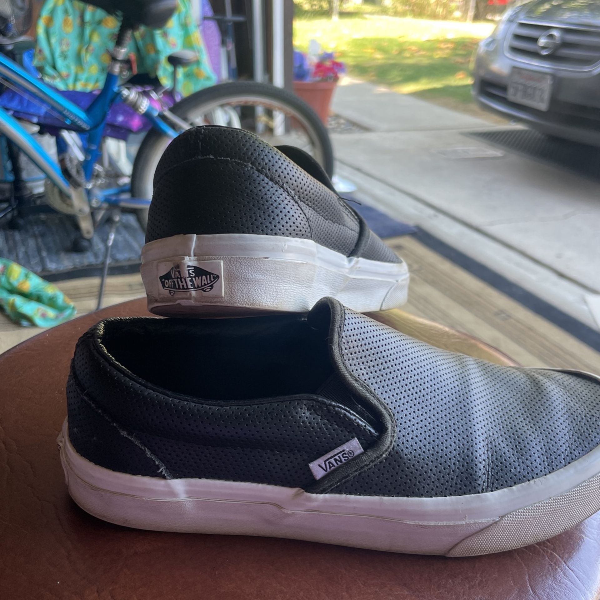 Hello I am selling these black vans. They are in good condition I wear a size 8 and the 7.5 size is too small for my foot there like a plastic material on top so very easy to wipe down pick up isavailable off of White Lane 🍕 and Grissom please check out my other items. I have been listing a lot lately and I am soon going to have a yard sale so if you like yard sales, let me know and I’ll tell you the date and time we have so much stuff . Thank you very much God bless and