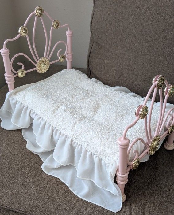 This is real metal doll bed coated with pink and gold, super cute but my daughter has outgrown. Sized for large dolls like American Girl