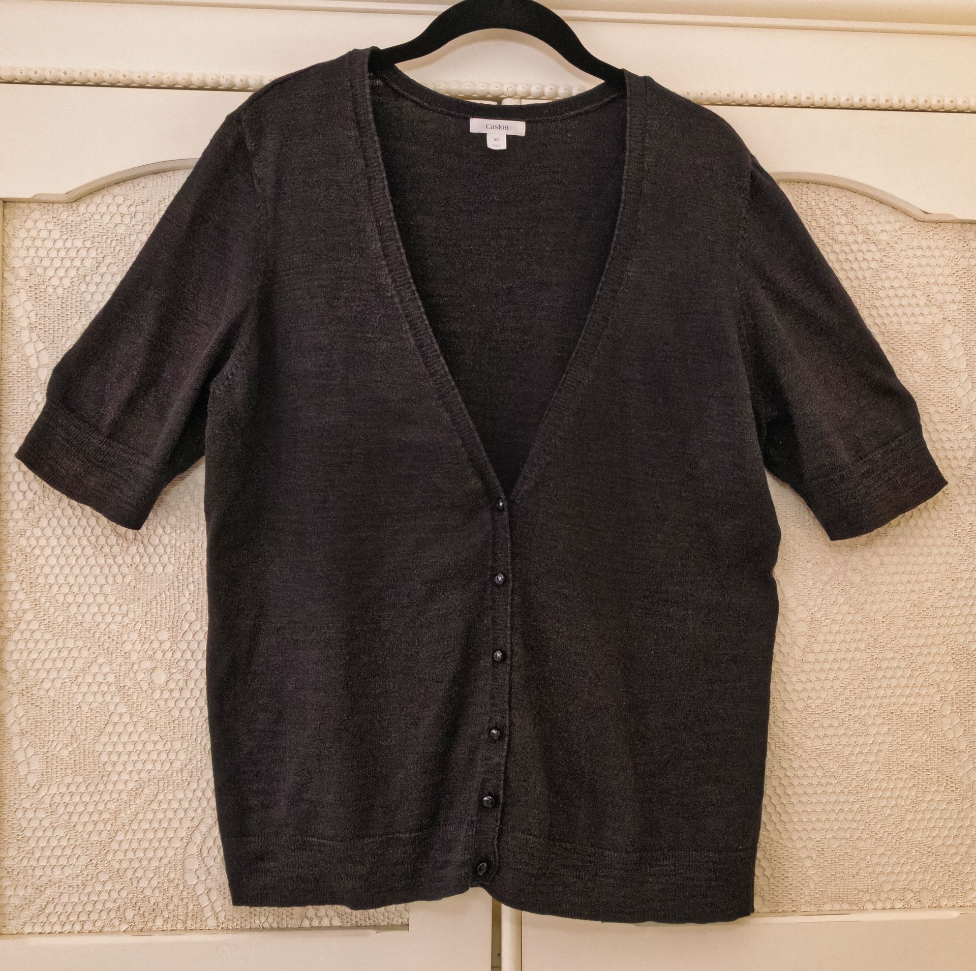 Caslon light weight black short sleeve cardigan. A great wardrobe staple for any occasion. V-neck and buttons in the front. In excellent preowned condition 20.5 Armpit to Armpit 24.5 Length