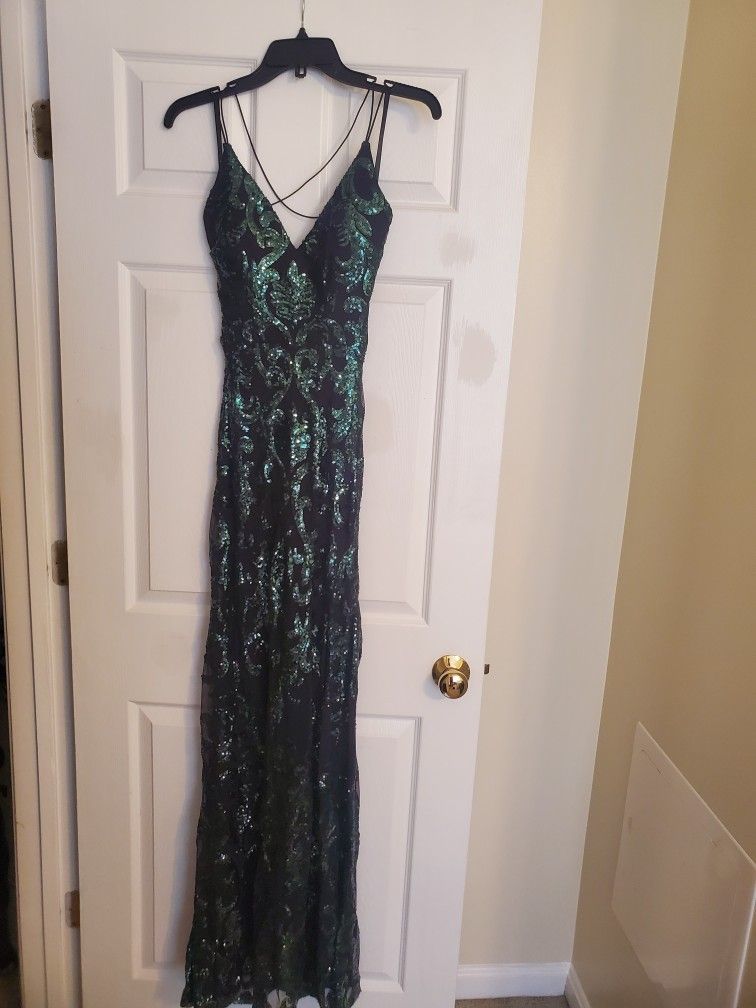 Two beautiful dresses. Can be worn to a wedding, prom, or nice formal event. 1. Green dress (only worn 1 to wedding) 2. Silver dress (never worn, still new)