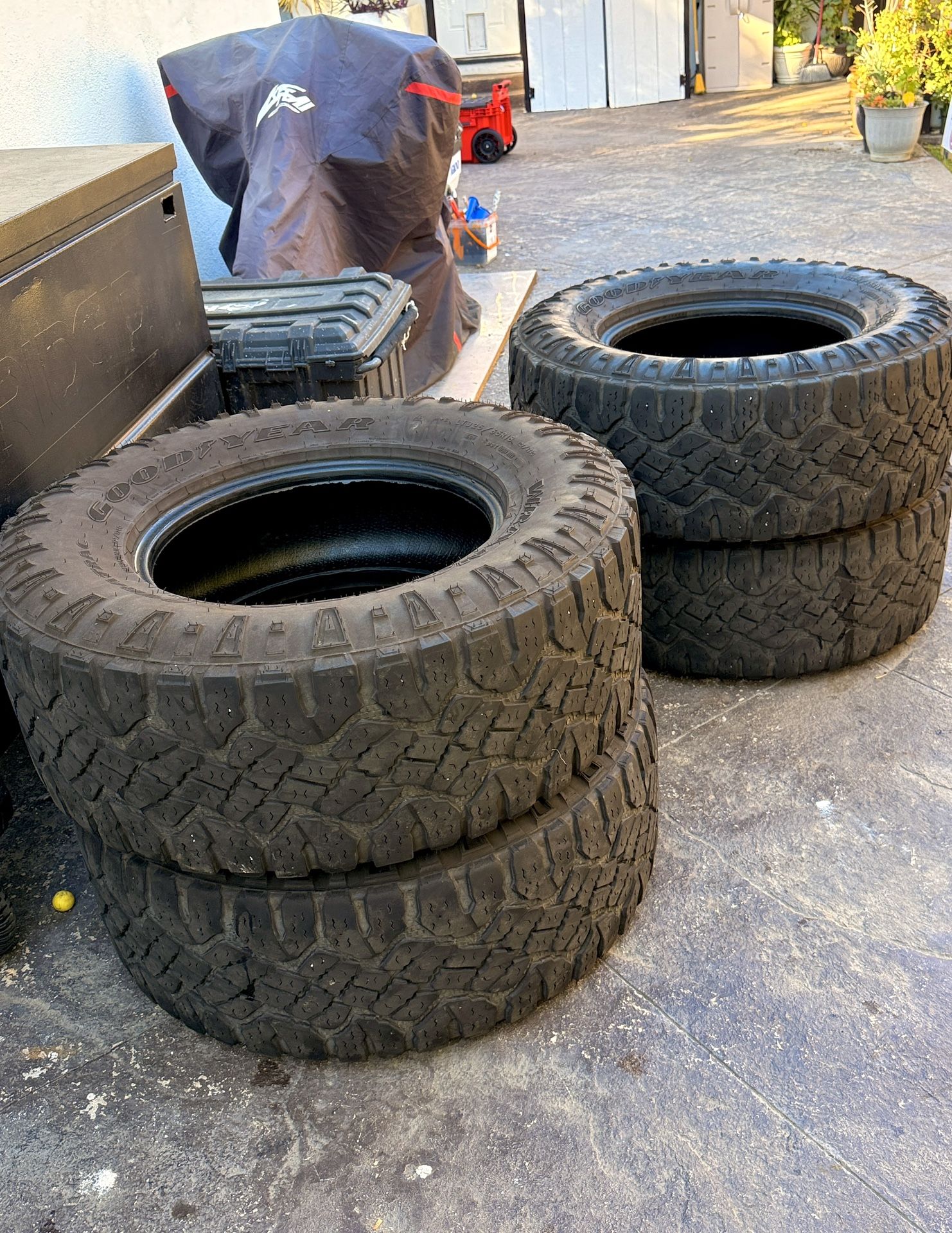Goodyear Duratrac Size LT325 65R18 Load range 127/124Q Made in USA DOT 0423 Set of four. Good tread, no patches, no damage. Just switched sizes on my truck, so these are ready to go. Pick up in Covina.