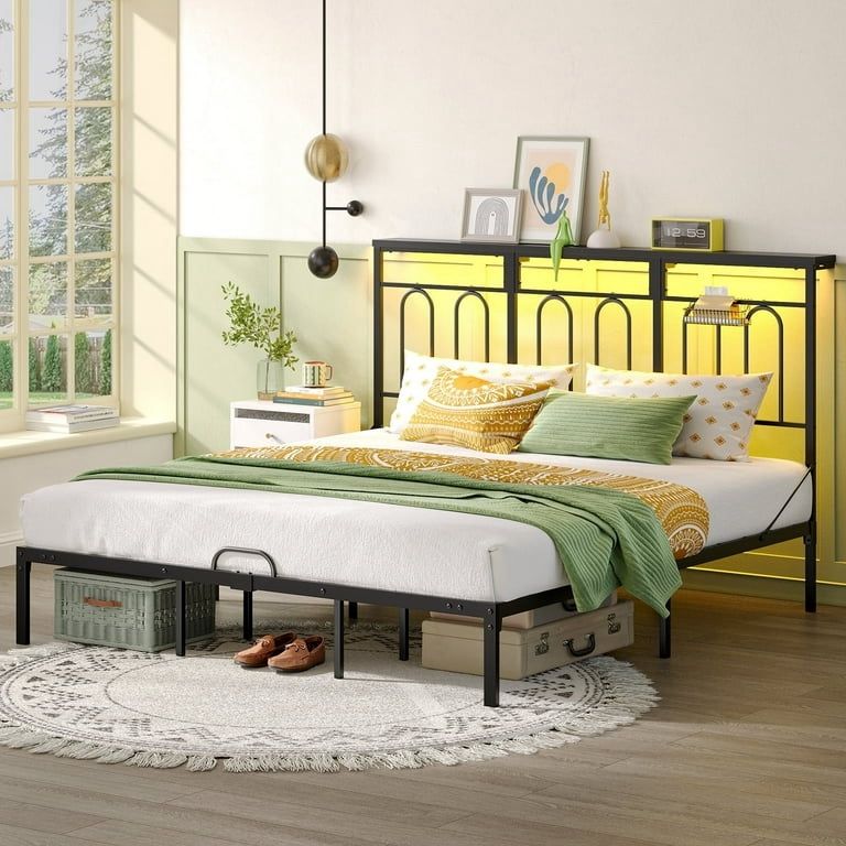 King Size Bed Frame with 49.2" High LED Storage Headboard Shelf, Metal Platform Bed with Charging Station, Black