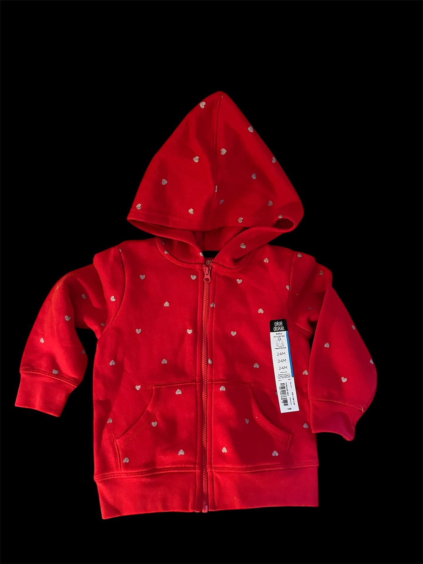Okie Dokie Heart Zip Up Hooded Sweat Jacket is NEW with the original manufacturer’s tag sticker, is in the original purchasing condition, and is a size 24 month’s tagging. Pictured in photos is manufacturer’s size tagging of hooded jacket.