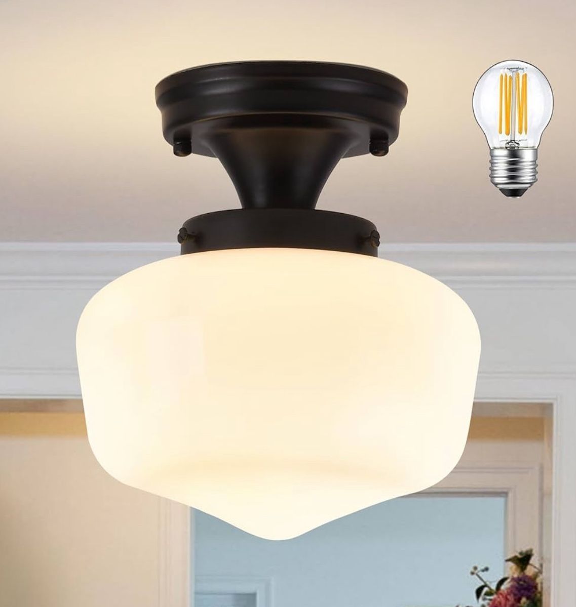 Black Schoolhouse Light Fixture 8" Mid Century Light Fixture Schoolhouse Light Fixtures Ceiling Milk Glass Light Fixtures Semi Flush Mount Ceiling Light for Bathroom (Bulb Incl.)