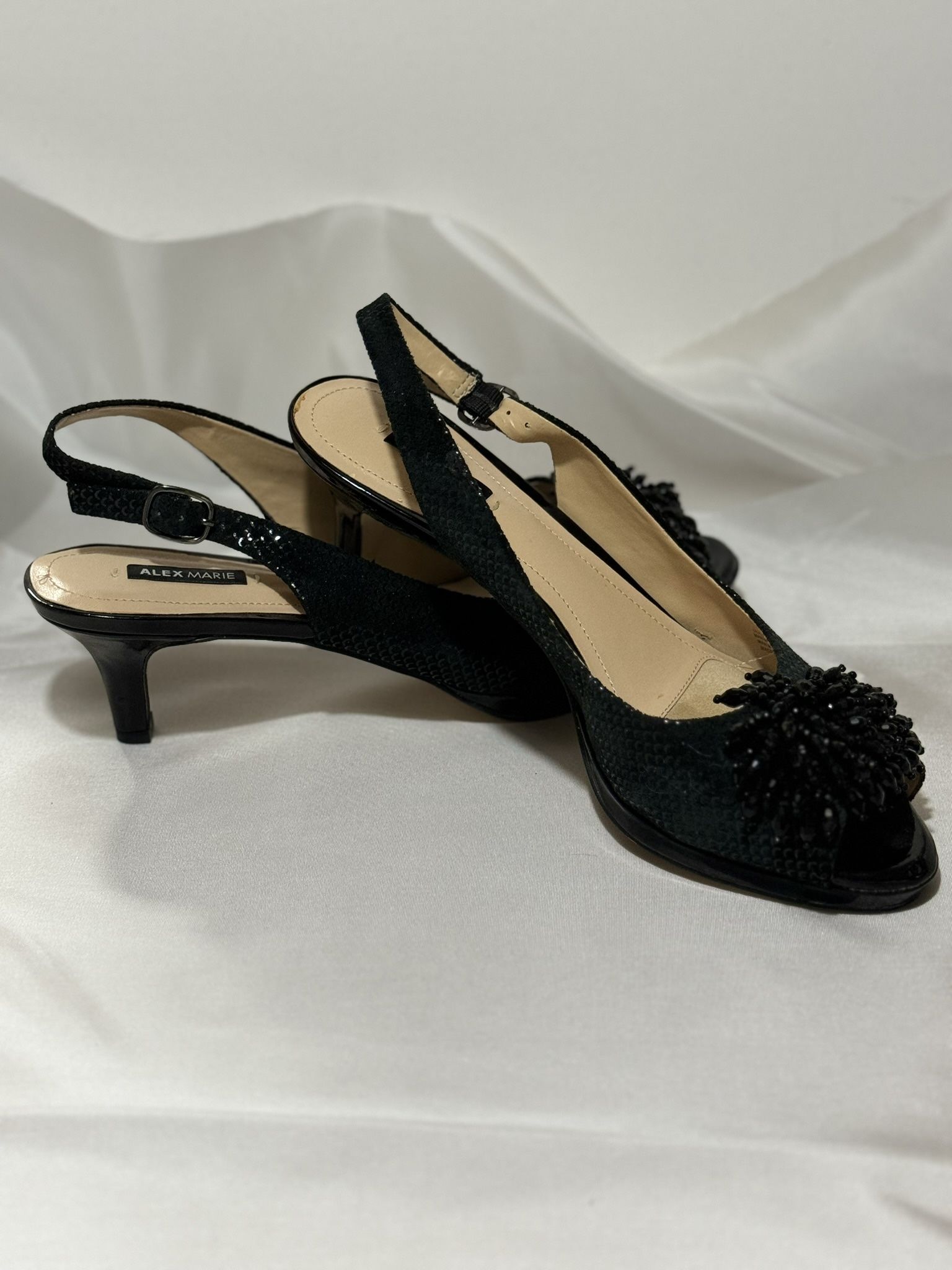 Alex Marie opened toe slingback, embossed suede sandal with patent leather heel and beaded accent across the toe area. Size 8 1/2. Both heels have nicked areas with some flaking of the inside material(pics show flaking).