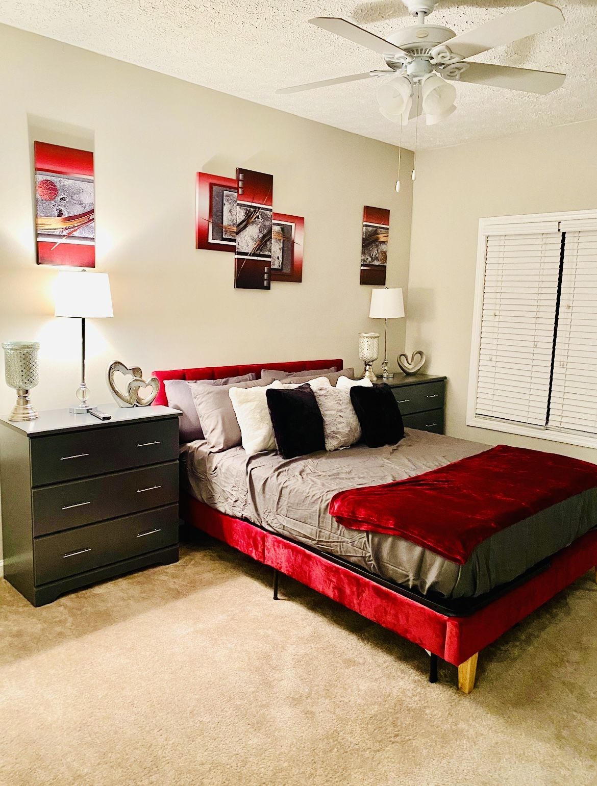 Barely used Queens size 10’ foam mattress, burgundy head board and foldable bed frame.