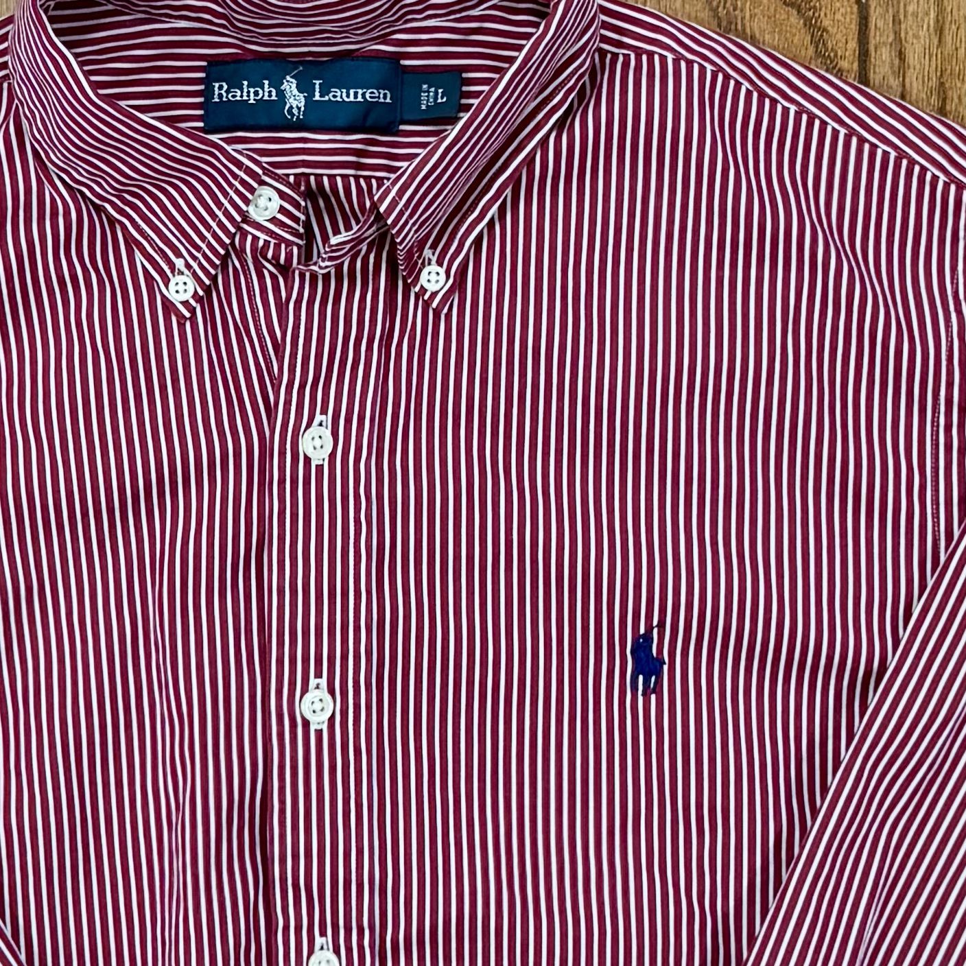 🦅 Red Striped Navy PONY Mens LARGE Ralph Lauren POLO Long Sleeve Collared Vintage Golf Dress Shirt