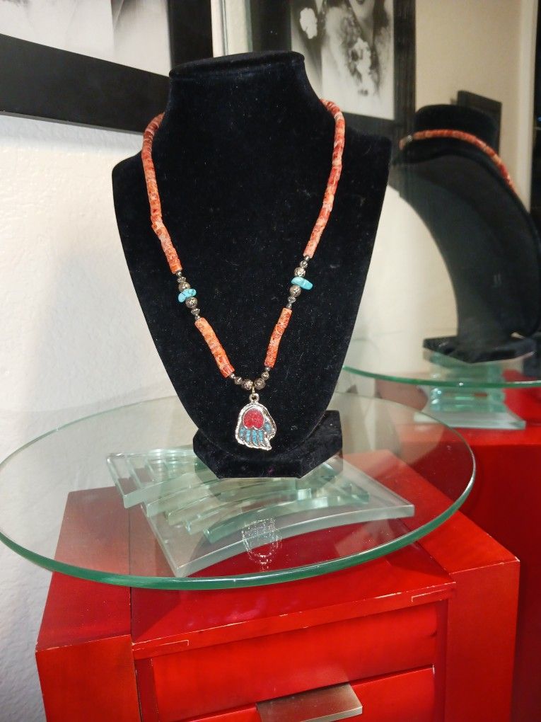 Turquoise , Red Coral , Silver Necklace With Bear Claw Pendant