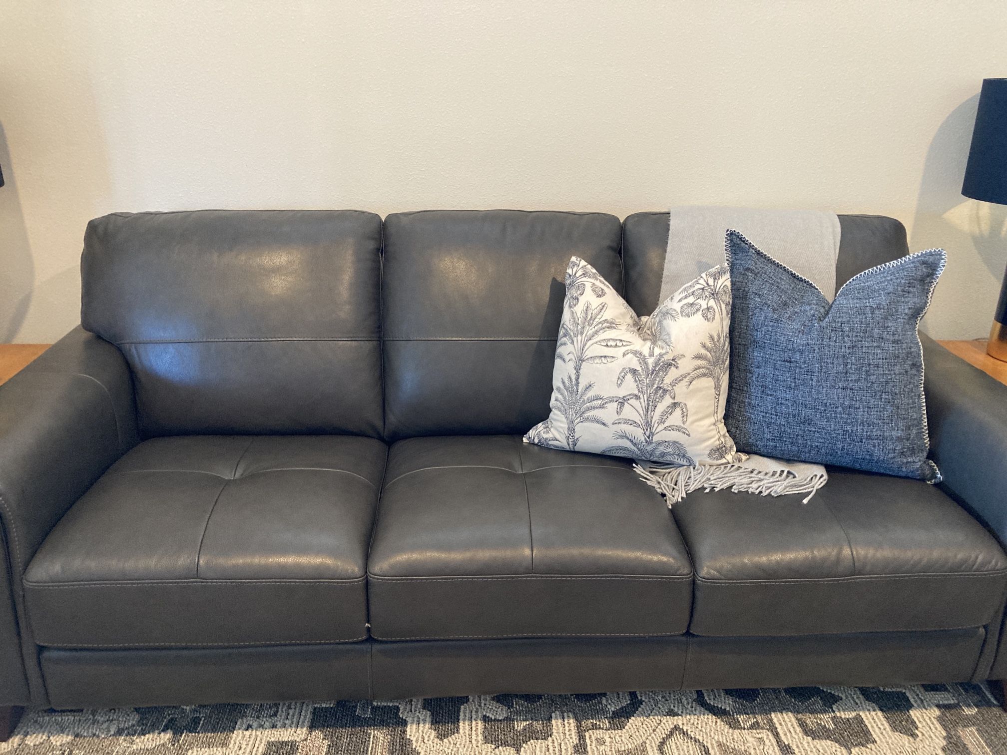 Beautiful Brayna leather charcoal couch. Like new, excellent condition, no scratches, marks. Very little use perfect condition. Pet fee smoke free home. You won’t be disappointed! Selling, it is to big need a smaller couch. Overall approx dimension 88”W x 37”D x 35” H. Seat depth approx 21.26” (Pillows and blanket not included)