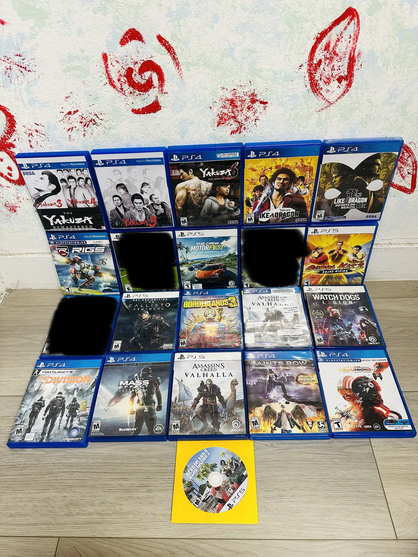 Starwar Squadrons : $10 Mass Effect Andromeda Deluxe Edition : $15 The Callisto Protocol (Day One Edition) $15 Saints Row : $10 Tom Clancy’s The Division : $10 The Crew Motorfest : $20 Assassint Creed Valhalla PS4 - $10 Cobra Kai 2 - $15 Yakuza 3 - Yakuza 4 : $30 Yakuza 5 : $30 Yakuza 6 : $30 Yakuza Like A Dragon : $20 Yakuza Like a Dragon Infinite Wealth ( New Sealed ) $40 Assassin Creed Valhalla PS5 : $15 Watch Dog Legion : $10 Borderlands 3 : $10 Rigs VR : $10 Batterfield : $10