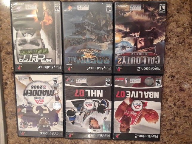 6 PlayStation 2 Video Games in very good to excelent condition. * Splinter Cell - Double Agent * Socom II - U.S. Navy Seals * Madden 2005 * NBA Live 07 * NHL 07 * FIFA 07 Buy all for $40 or $7 each