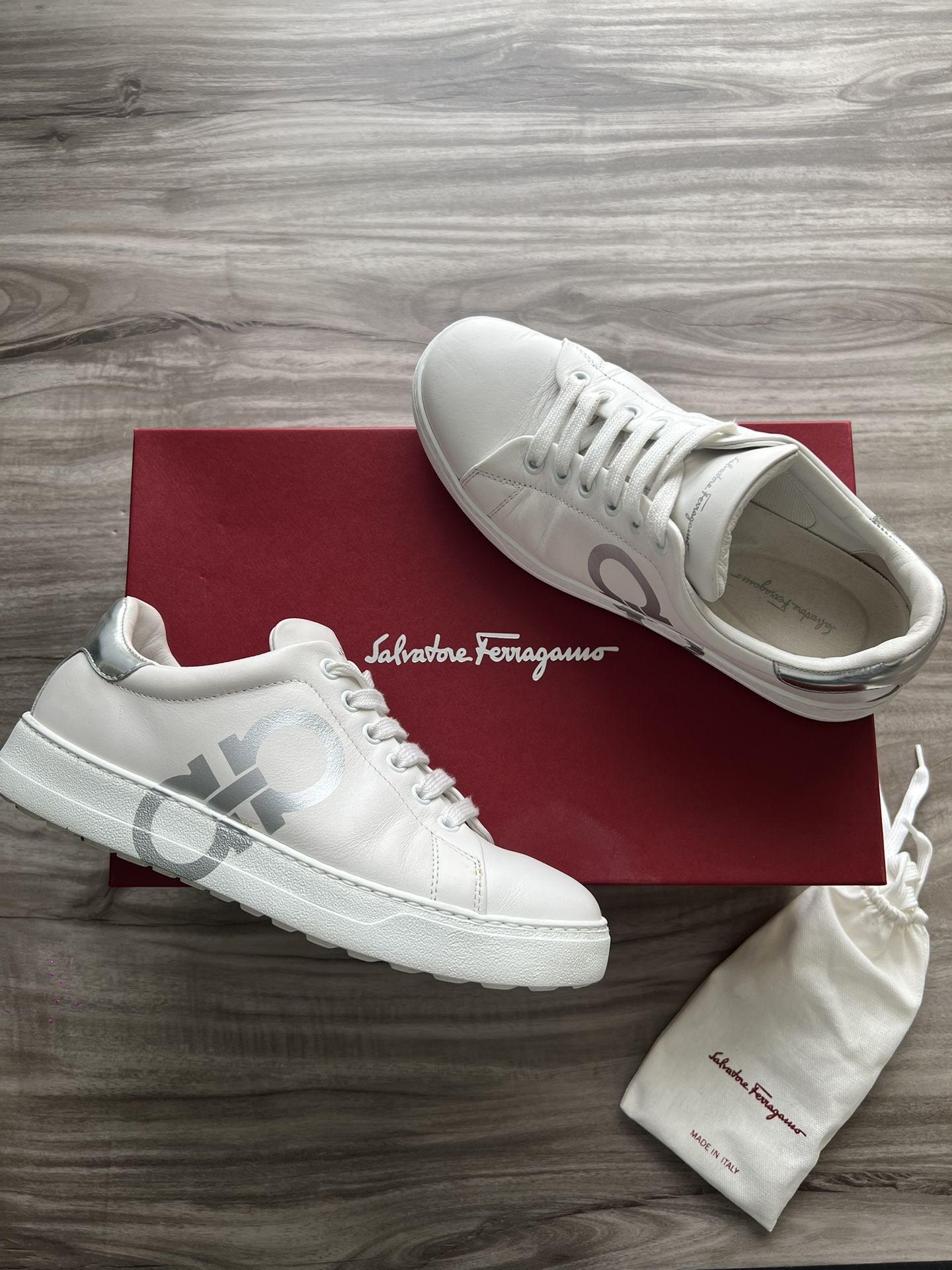 Welcome to Byrd Boxx Offer Up Store! First class designer and luxury items at second hand pricing📦✅ Salvatore Ferragamo Number Leather Sneaker Size 6.5 Women’s 100% authentic. Original box and extra laces included. Little to no sign of wear! Please be sure to ask any additional questions, and to check out our other high end and luxury listings!
