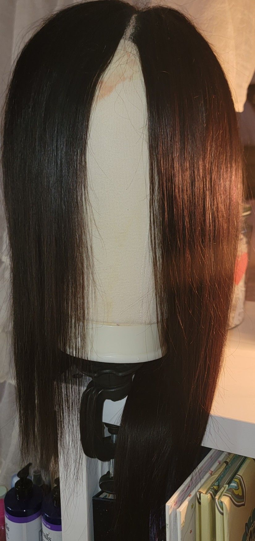 Purchased this from my hair girl who sells and installs hair extensions. She made this with with human hair. It's dark brown. Can be curled and died. I haven't done any of that yet,so it's in new condition. I did pluck the hairline and snipped the lace a bit, making a tiny hole. But you can easily buy clear thread and fix. I paid $120, seling it for $65. I need a longer wig. This is only 18 inches. I did wear put once. Sorry no holds meet ups nor drop offs. I exccept venmo cash app zelle or cash last option. Pick up location is in Wilmington.